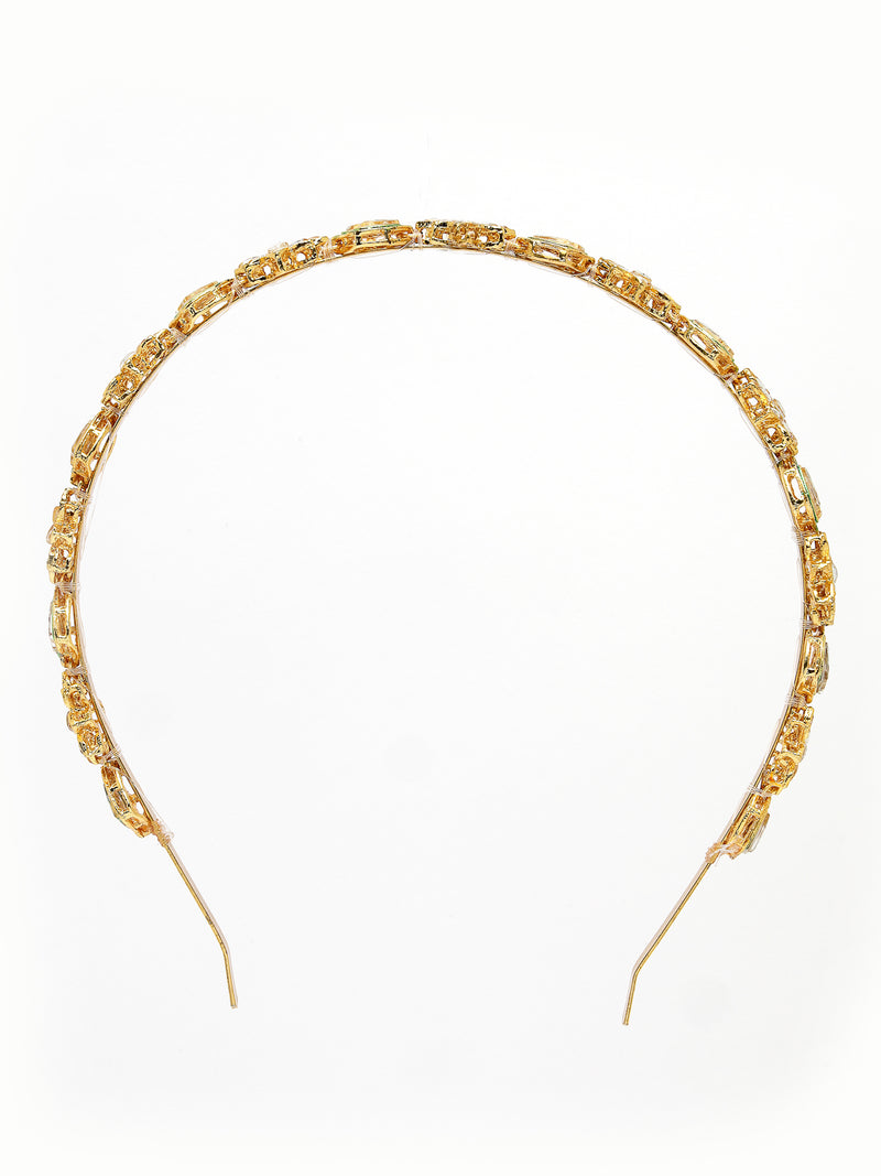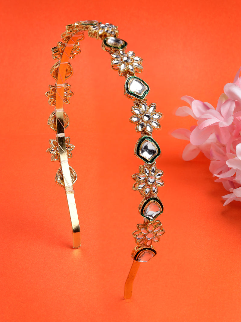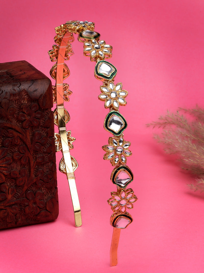 The Sukkhi Attractive Floral Gold Plated Kundan Studded Hair Band Matha Patti is a beautiful and elegant hair accessory that adds a touch of tradition to any look. Featuring intricate floral designs and Kundan stones, this piece is further enhanced with green Meenakari work for a vibrant and eye-catching appearance. The gold-plated finish offers a refined look, making it a perfect addition to weddings, festivals, and other special occasions. Ideal for women and girls, this Sheesh Patti or Matha Patti will complement your hairstyle, adding a graceful and stunning touch to your overall ensemble. Perfect for adding charm to any occasion.