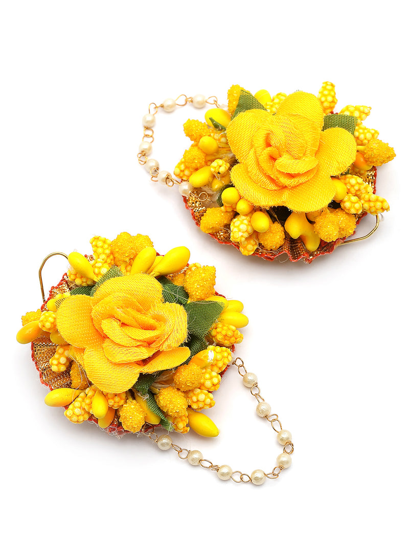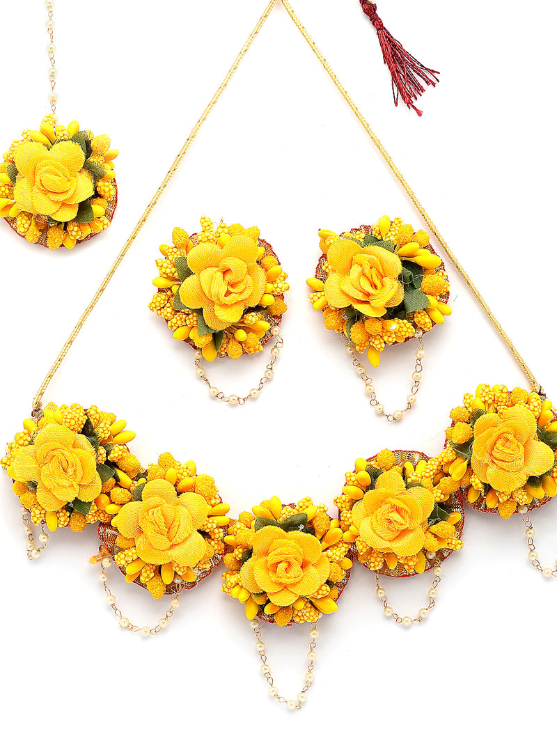 Sukkhi Decorative Stylish Fashion Flowers Handmade Yellow Jewellery Set for Haldi Gota Patti Necklace Earrings Bracelet & Maangtikka for Women & Girls|Mehandi/Haldi/Wedding/Bridal/Baby Shower|NS107466|Add a burst of sunshine to your celebration look with the Sukkhi Decorative Stylish Fashion Flowers Handmade Yellow Jewellery Set. Designed for festive occasions like Haldi, Mehendi, weddings, bridal events, and baby showers, this set features a floral necklace, earrings, bracelet, and maangtikka with traditional Gota Patti elements. The handcrafted flowers in vibrant yellow bring a fresh and joyful vibe to your ethnic wear. Lightweight and easy to pair with sarees, lehengas, or salwar suits, this set is perfect for creating memorable looks. Celebrate your special moments with this bright and beautifully crafted floral jewellery set.