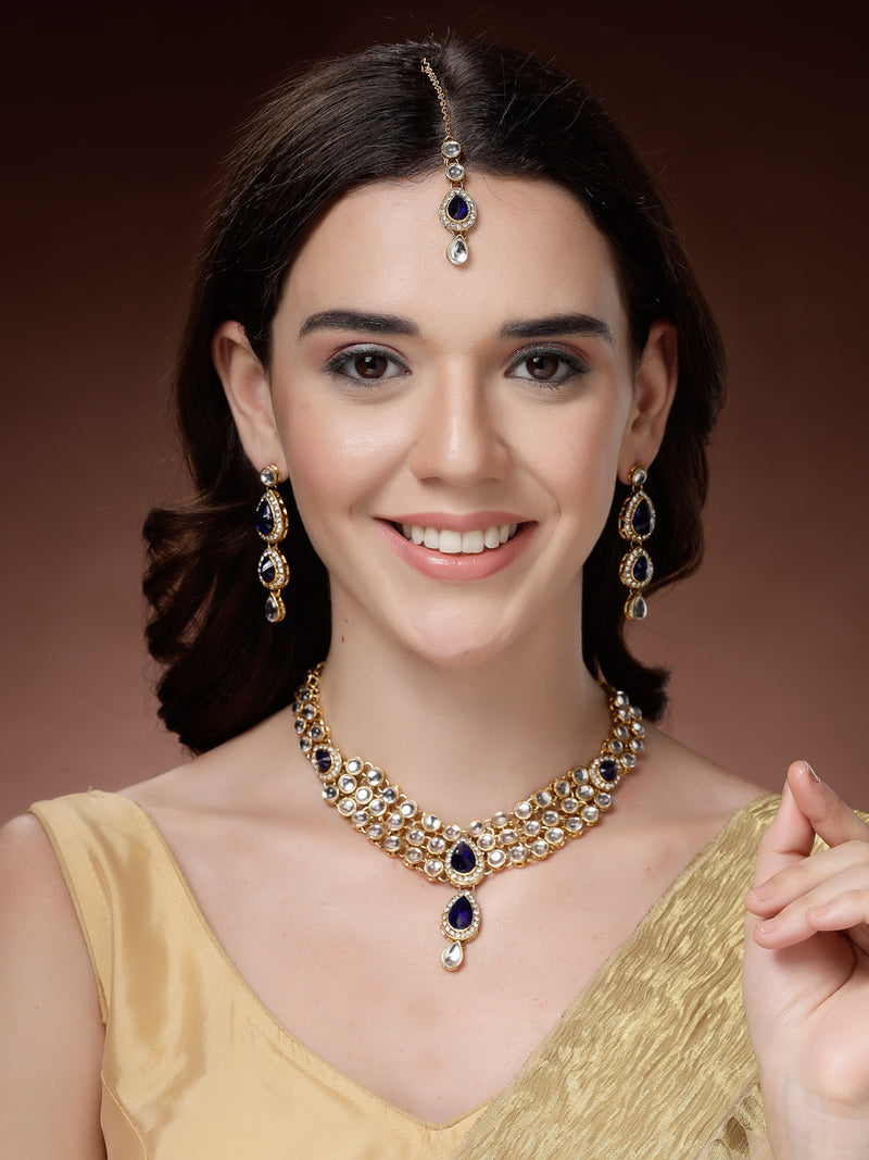 Sukkhi Elegant Stylish Gold Plated Kundan Studded Blue Choker Necklace with Drop Earring Maangtikka Jewellery Set for Women & Girls|NS107370|Make a striking impression with the Sukkhi Elegant Stylish Gold Plated Kundan Studded Blue Choker Necklace Set. This beautifully crafted jewellery set features a rich blue choker adorned with sparkling Kundan stones, paired with matching drop earrings and a delicate maangtikka. Designed for women and girls who appreciate refined details and festive flair, this set enhances any traditional or party ensemble. Whether it’s a wedding, celebration, or cultural event, the vivid hues and detailed craftsmanship add a graceful charm. Perfect as a thoughtful gift or a statement piece for your own collection, this set brings tradition to life with style.