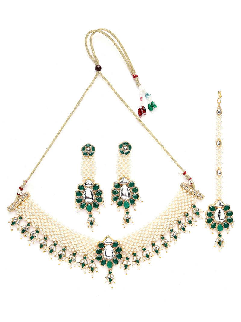 Sukkhi Eye-Catchy Gold Tone White Pearls Green Choker Necklace Set with Long Danger Earrings & Maangtikka Jewellery Set For Women|Set of 1|NS106044