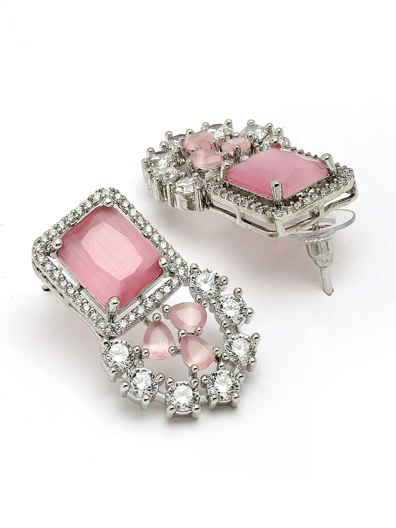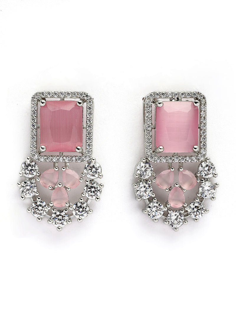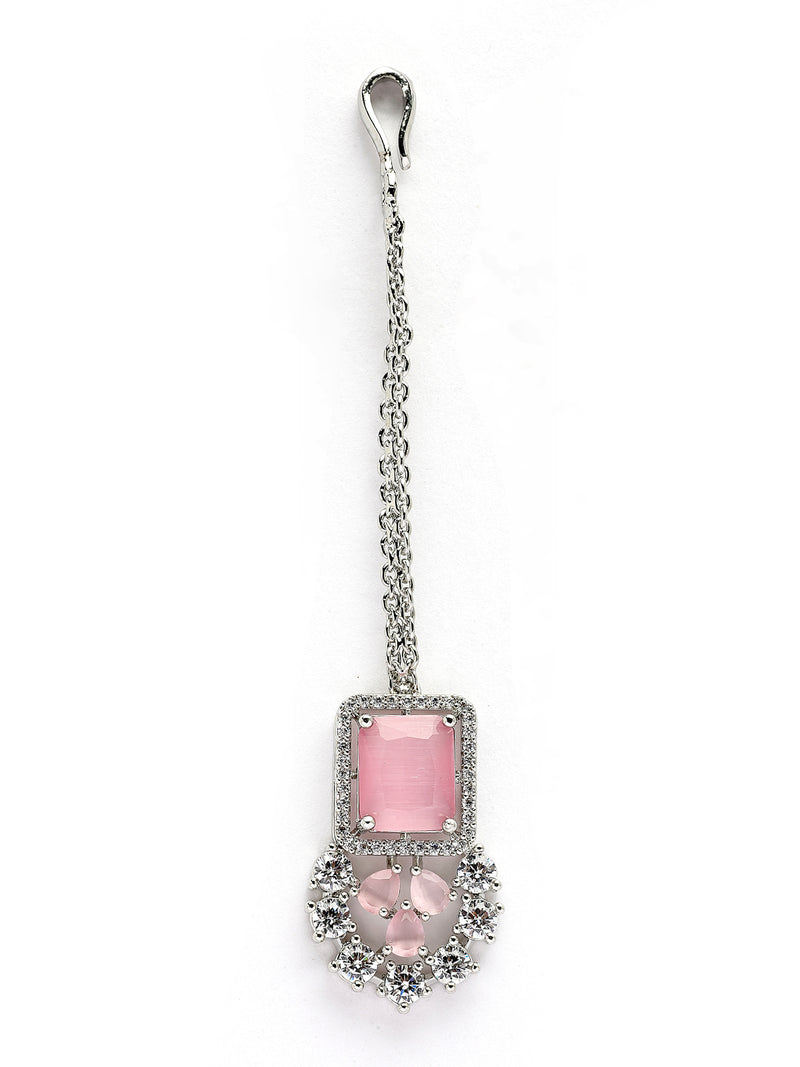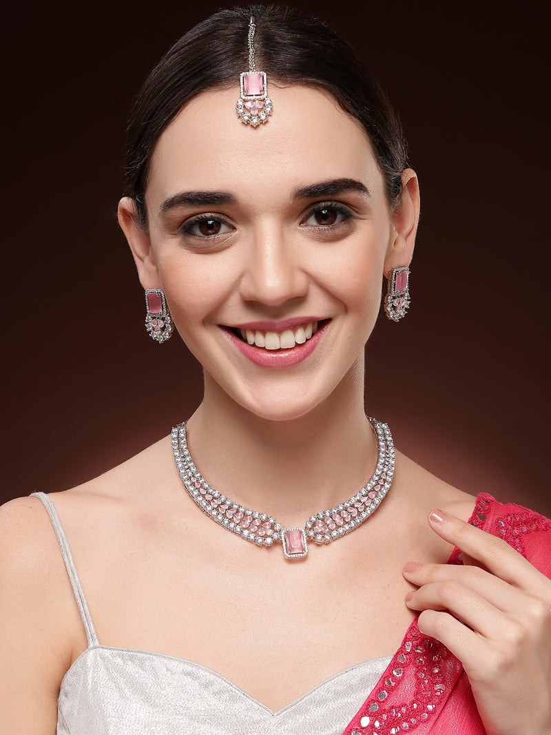 Sukkhi Preety Pink Stylish Rhodium Plated Cubic Zirconia Diamond Studded Brass Collar Necklace Set is designed to add elegance and charm to every occasion. Crafted from good quality brass with a long lasting rhodium polish, this jewellery set features sparkling pink cubic zirconia stones that deliver a diamond like shine. The set includes a beautifully designed collar necklace, matching stud earrings, and a graceful maangtikka, making it perfect for weddings, parties, festivals, and celebrations. Lightweight, & comfortable to wear, this stylish set also makes an ideal gift for women on birthdays, anniversaries, and festive occasions.