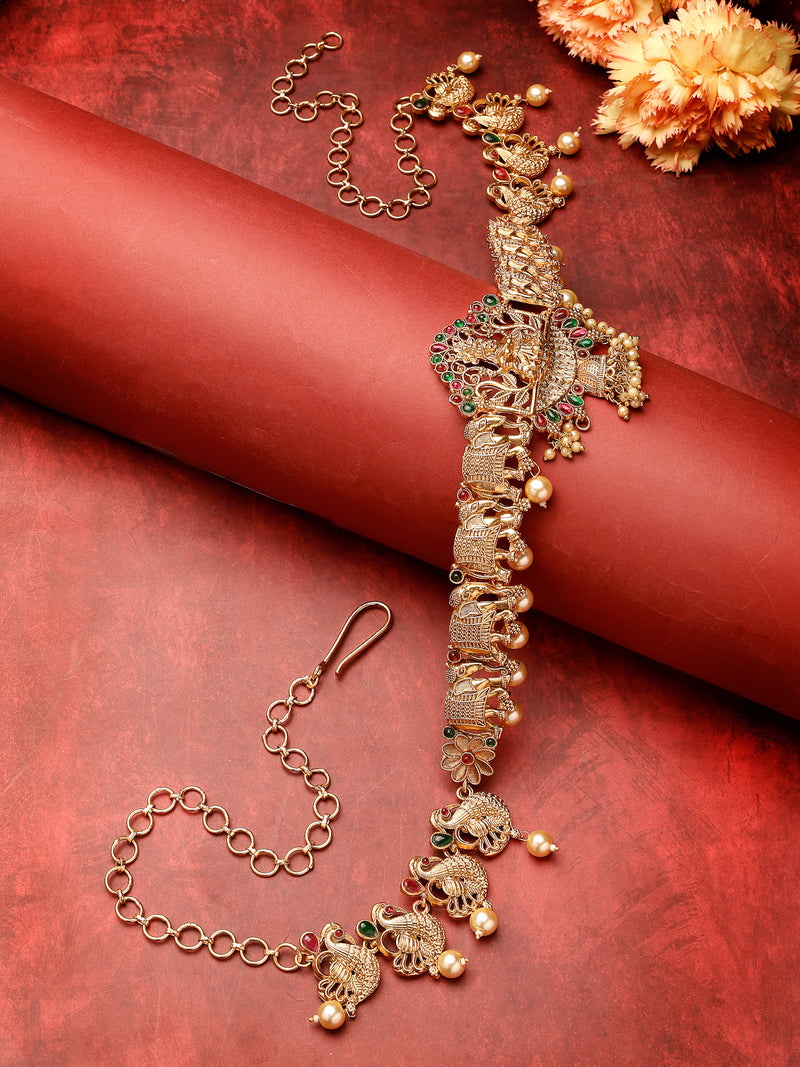 * Traditional Design: Sukkhi Temple Laxmi Gold Plated Kamaraband features intricate temple motifs, adding a cultural charm to your attire.Gold Plating: The gold plating adds a radiant finish, making it a long-lasting and vibrant accessory.