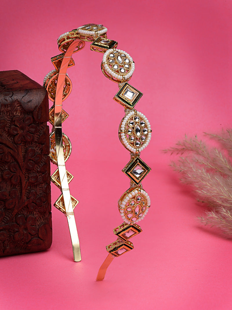 * Traditional Design: This Sukkhi hairband Matha Patti features a timeless traditional style with intricate Kundan beadwork, adding cultural elegance to your look.Gold Plating: Crafted with a gold-plated finish that enhances its classic charm, perfect for weddings and festive occasions.
