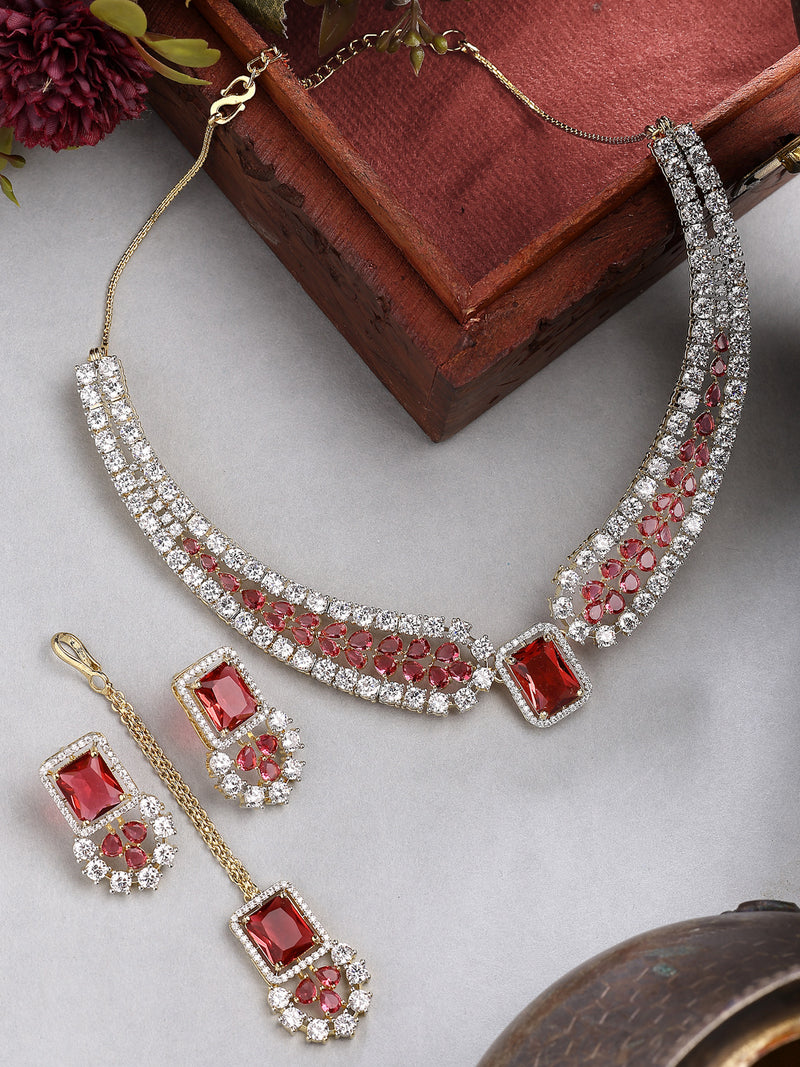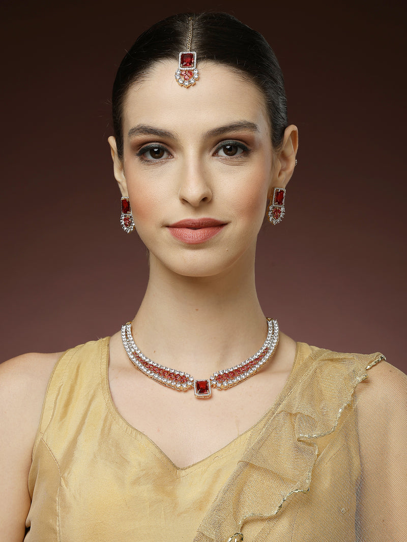 Sukkhi Unique Stylish & Designer Gold Plated Cubic Zirconia Studded Red Brass Collar Necklace Set is created to make a bold and elegant style statement. Crafted from good quality brass with a rich gold plated finish, this jewellery set features radiant red cubic zirconia stones that deliver a stunning diamond like sparkle. The set includes a beautifully designed collar necklace, matching stud earrings, and a graceful maangtikka, making it perfect for weddings, festive celebrations, parties, and special occasions. Lightweight, and comfortable for long wear, this elegant jewellery set also makes an ideal gift for women on birthdays, anniversaries, and festive events.