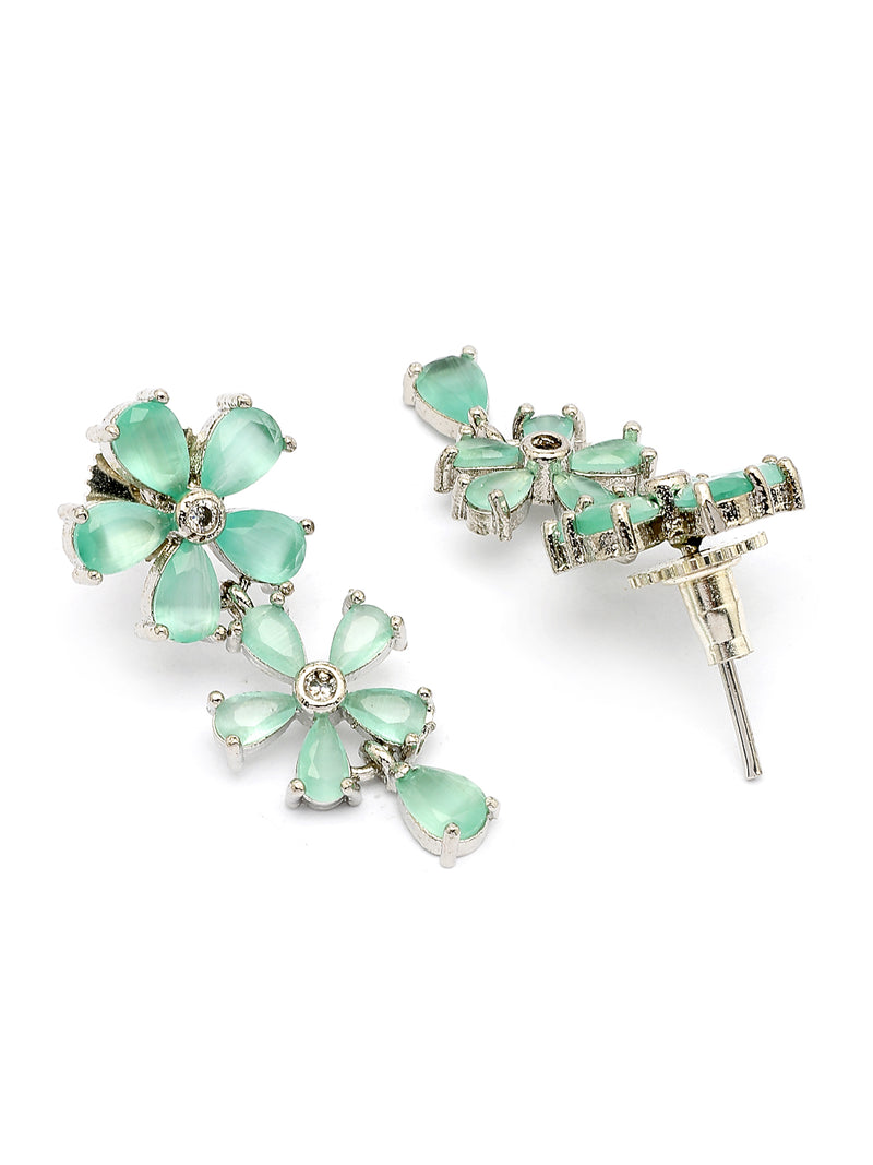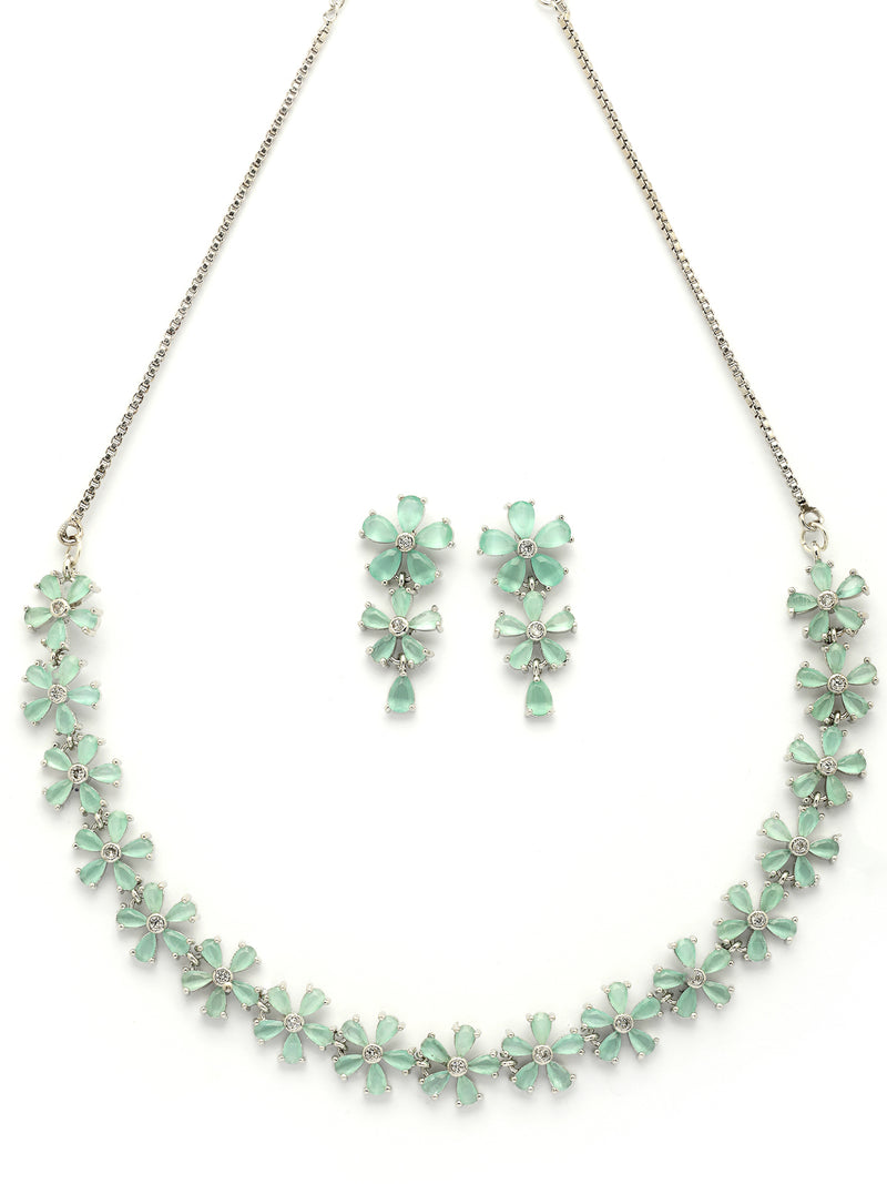 Sukkhi Attractive Rhodium Plated Silver Toned with American Diamond Studded Floral Shaped Sea Green Choker Necklace with Drop Earring Jewellery Set For Women & Girls|NS107418|Add a refreshing touch to your accessory collection with the Sukkhi Attractive Rhodium Plated Silver Toned Jewellery Set. This sea green choker necklace features an intricate floral design, studded with sparkling American diamonds for a radiant finish. The coordinated drop earrings complete the look, making this set a perfect choice for festive celebrations, weddings, or evening events. Its graceful appeal complements both ethnic and contemporary attire. Whether you're dressing up for a special day or elevating a casual outfit, this jewellery set offers a striking presence and timeless charm. A stylish option for women and girls who love bold accents.
