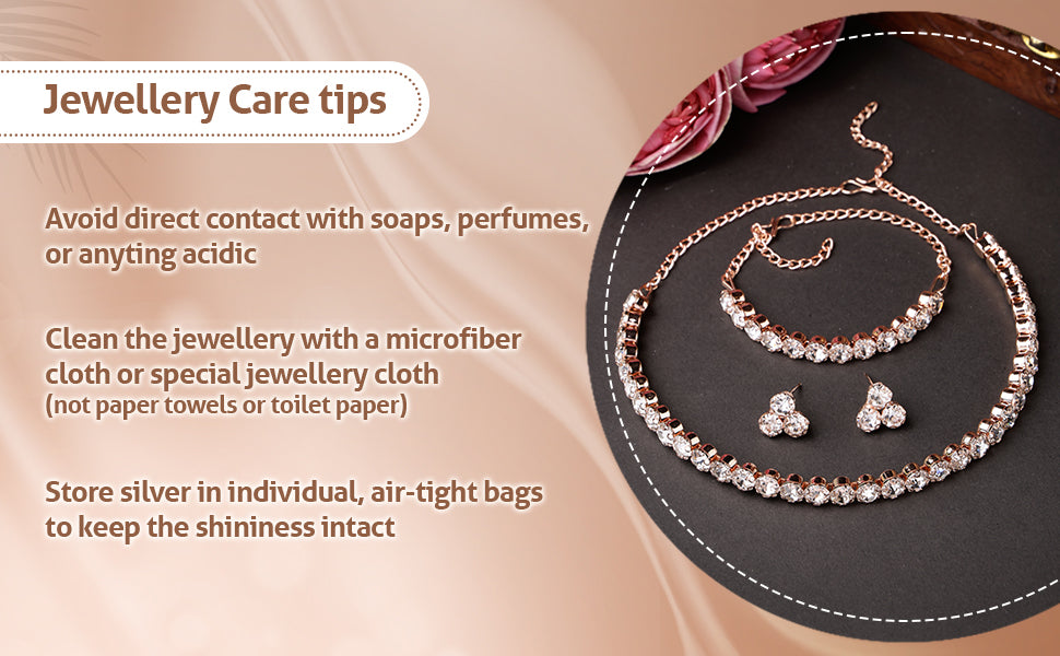 * Elegant Design: This set features a decorative choker necklace studded with crystal stones, complemented by matching stud earrings and an adjustable bracelet for a complete look. Rose Gold Plating: The necklace, earrings, and bracelet are plated with rose gold, offering a sophisticated and modern shine.