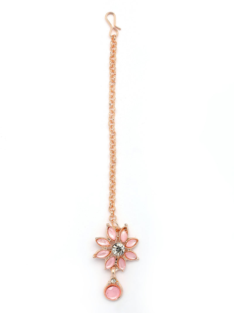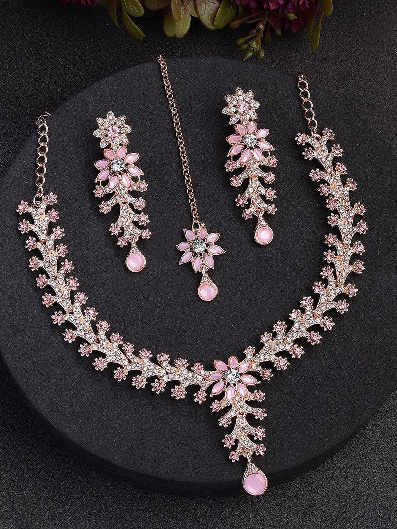 Sukkhi Delicate Fashion Style Gold Plated AD Stones Studded Floral Style Pink Choker Necklace with Dangle Earring & Maangtikk Jewellery Set For Women & Girls|NS107386|The Sukkhi Delicate Fashion Style Jewellery Set features a gold-plated pink choker necklace adorned with sparkling AD Stones in a beautiful floral design. This elegant set includes matching dangle earrings and a maangtikka, perfect for adding a graceful touch to any outfit. Designed for women and girls, it blends traditional charm with a modern appeal, making it ideal for festive occasions, weddings, or special events. The intricate detailing and vibrant pink shade create a captivating look that enhances your overall style. This set is a versatile choice to elevate your collection with eye-catching elegance and delicate craftsmanship.