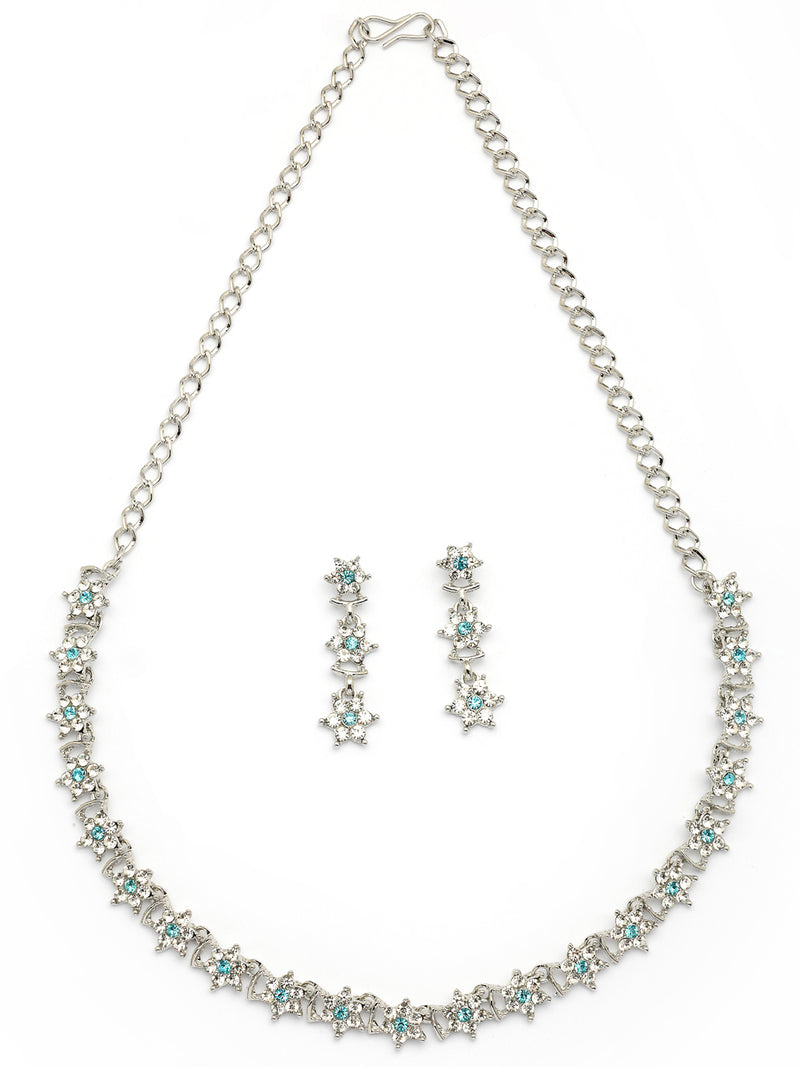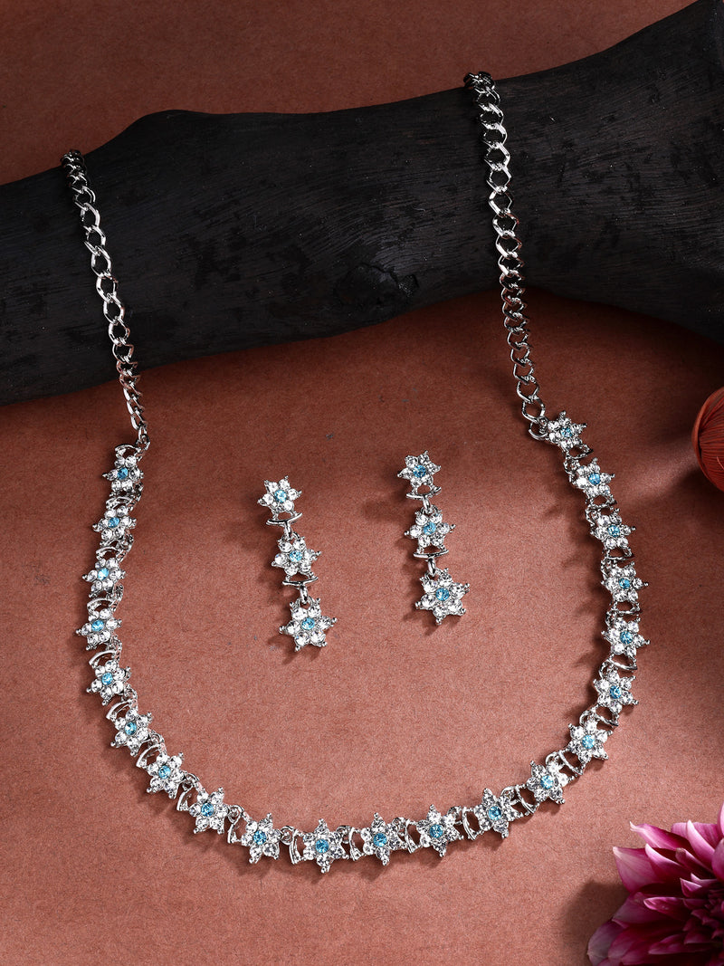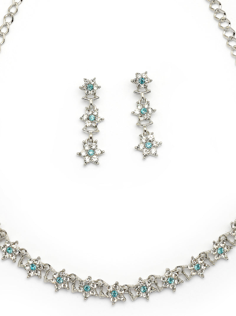 Sukkhi Latest Stylish Floral Design Rhodium Plated AD Stones Silver Choker Necklace Set with Dangle Earrings Jewellery for Women|Jewellery for Party, Wedding, and Festive Occasions for Women|Sukkhi introduces a stylish floral design choker necklace set, crafted with attention to detail and finished in rhodium plating for a polished silver look. The necklace is adorned with sparkling AD stones that enhance its beauty, making it a captivating choice for women who appreciate graceful and elegant jewellery. Paired with matching dangle earrings, this set complements both traditional and contemporary outfits with ease. Ideal for festive occasions, weddings, or special events, it adds a refined statement to your ensemble. A thoughtful gift choice for your loved ones on birthdays, anniversaries, or cultural celebrations.