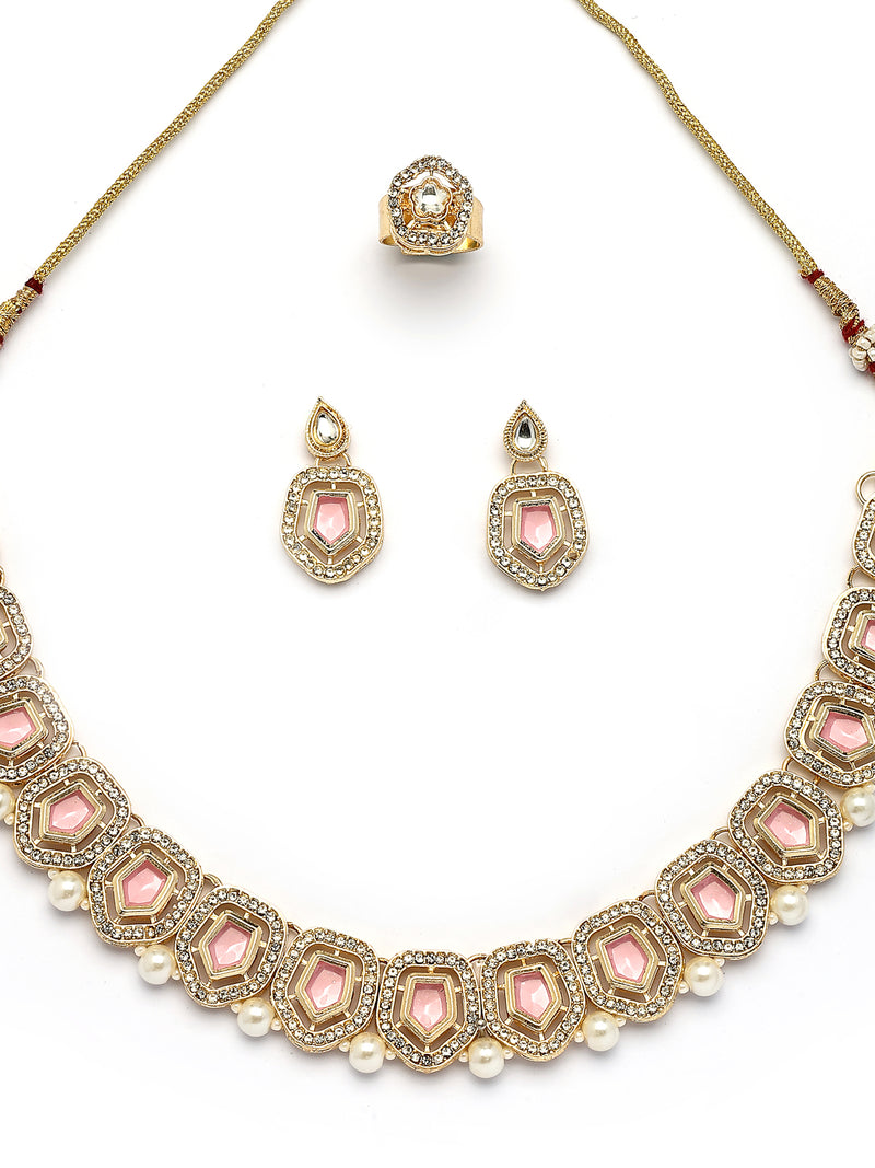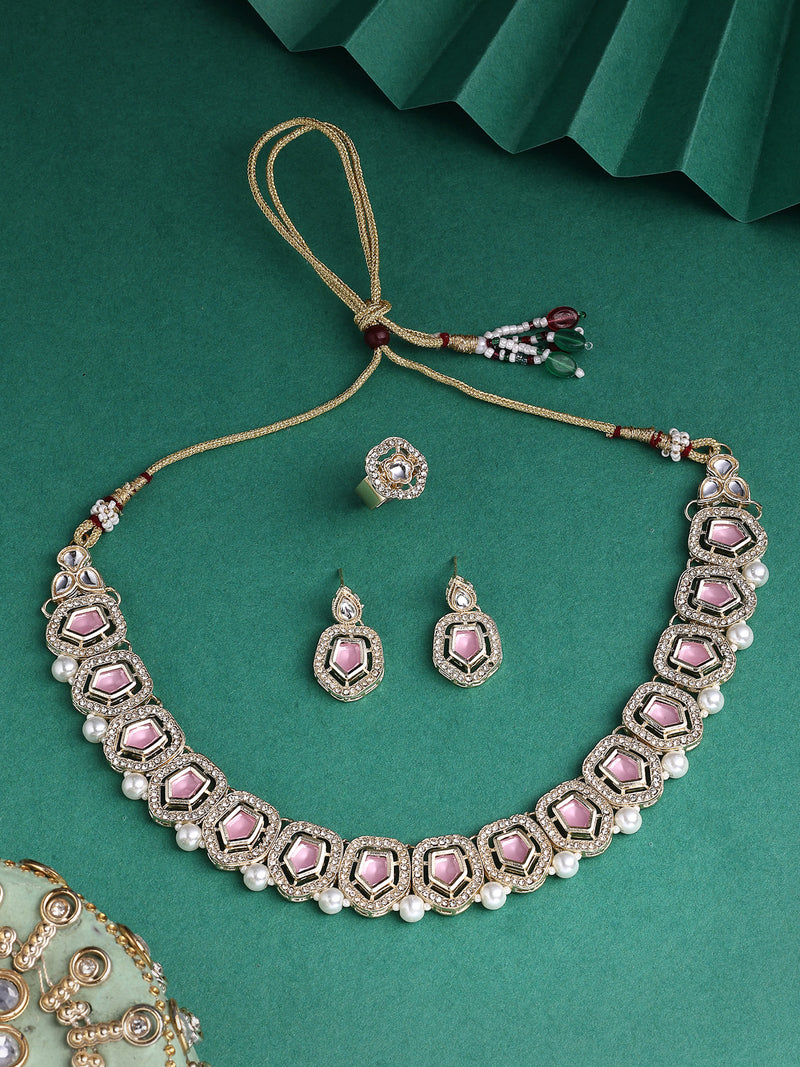 Sukkhi Modern Stylish Gold Plated AD Stones Studded Pink Choker Necklace Set with Drop Earrings Jewellery for Women & Girls|Jewellery for Party, Wedding, and Festive Occasions for Women|Make a graceful style statement with this modern and stylish choker necklace set from Sukkhi, designed for women who love elegance with a touch of tradition. This gold-plated set is adorned with dazzling AD stones and soft pink accents that beautifully complement festive and ethnic outfits. The drop earrings add a charming finish to the set, making it ideal for special occasions like weddings, parties, and festive celebrations. Whether paired with a saree or a fusion ensemble, this jewellery set helps elevate your overall look. A thoughtful gift choice for loved ones who appreciate timeless beauty and fine craftsmanship.