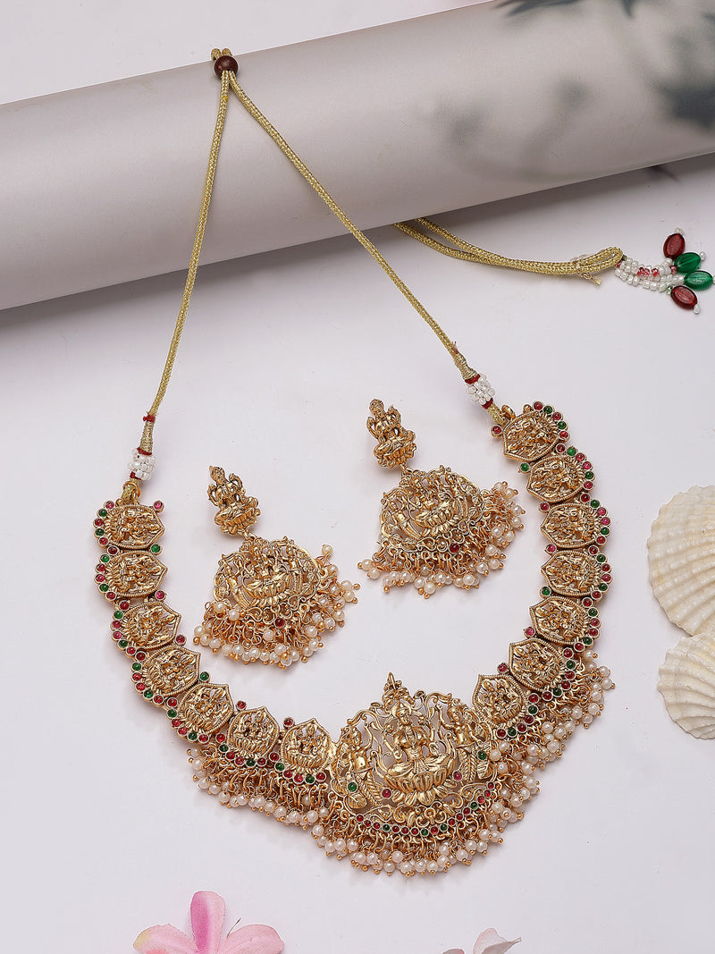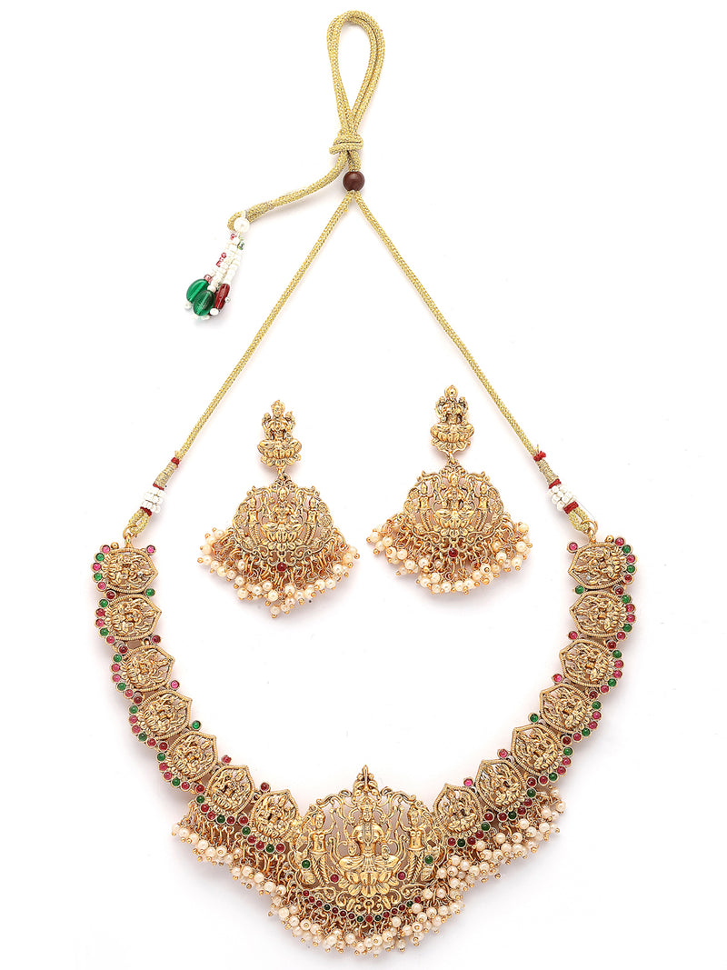 Sukkhi South Indian Traditional Matte Gold Plated Maharani Haar Red Green Choker Necklace with Dangle Earring Jewellery Set for Women & Girls|NS107414|Celebrate heritage with the Sukkhi South Indian Traditional Maharani Haar Jewellery Set, designed to reflect timeless beauty and cultural charm. This set features a matte gold plated choker necklace adorned with striking red and green accents, paired with elegant dangle earrings. The intricate detailing and regal design evoke the grandeur of royal traditions, making it an excellent choice for weddings, festivals, and special occasions. Perfect for women and girls who appreciate traditional craftsmanship, this set blends classic motifs with vibrant colors to create a standout look. Add a majestic touch to your ethnic wardrobe with this stunning jewellery ensemble.