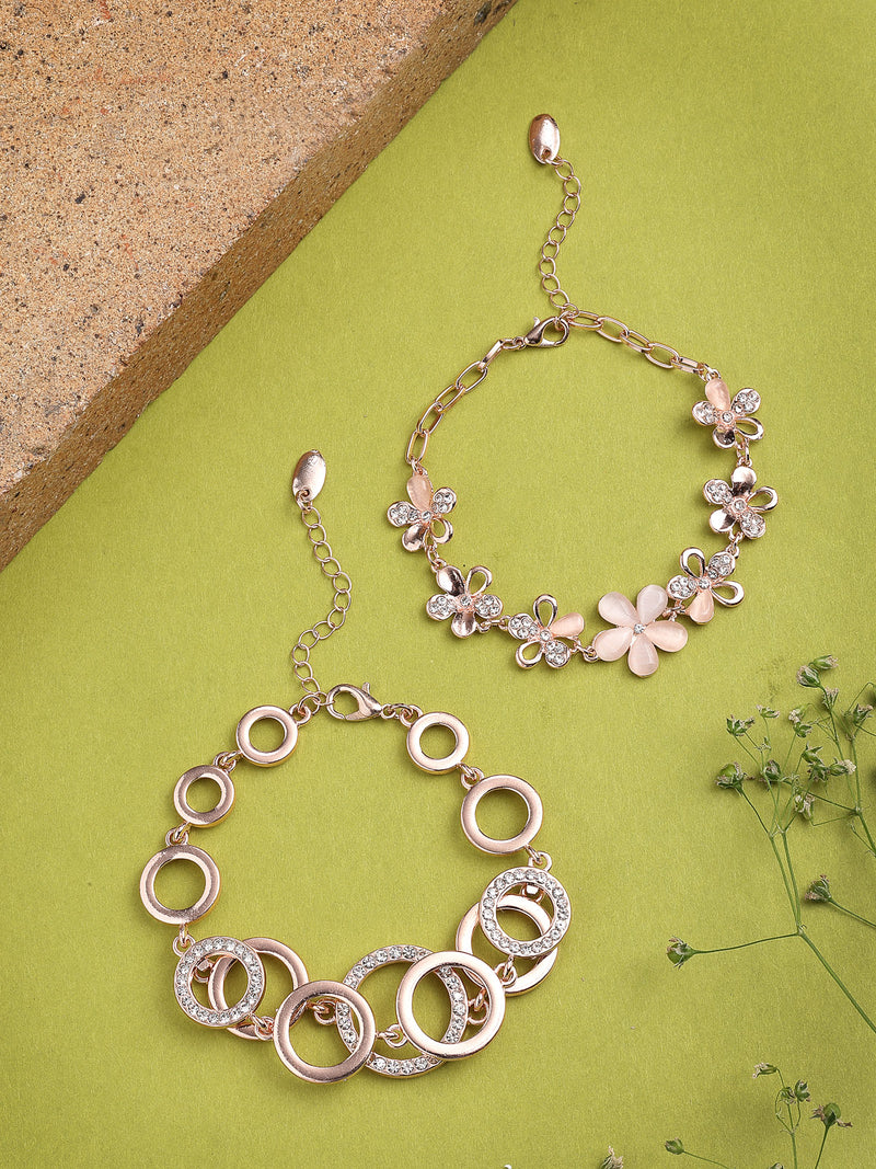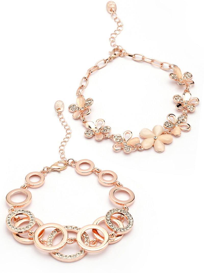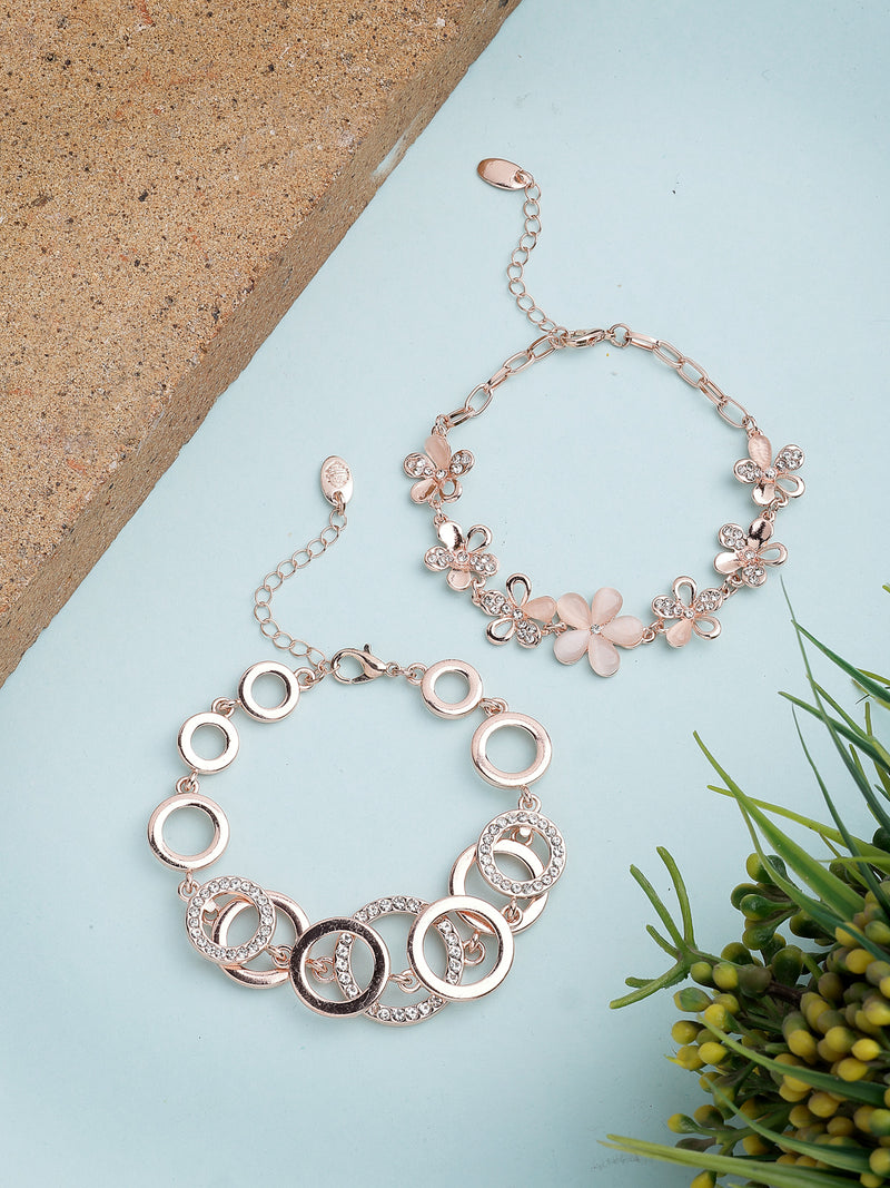 Scintillare By Sukkhi Classic Stylish Fashion Design Rose Gold Plated Crystal Cubic Zirconia Charm Bracelet Combo Jewellery for Women & Girls|Pack of 2. Scintillare By Sukkhi presents a classic and stylish charm bracelet combo crafted with rose gold plating and adorned with shimmering cubic zirconia stones. Designed to complement both everyday outfits and festive looks, these bracelets feature elegant detailing and a comfortable fit. The delicate charms add a graceful sparkle, making them perfect for women and girls who appreciate refined accessories. Whether worn solo or stacked, this combo set brings a touch of sophistication to your wrist. A thoughtful gifting option for birthdays, celebrations, or casual occasions, this jewellery set blends tradition with modern flair in a timeless fashion.