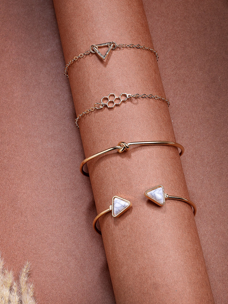 Scintillare By Sukkhi Unique Fashionable Gold Plated Set of 4 Multistyle Charm Kada Bracelet Combo Jewellery for Women & Girls|Pack of 4. Scintillare By Sukkhi presents a unique and fashionable combo of 4 gold-plated charm kada bracelets designed to suit different moods and outfits. This versatile set features a mix of multistyle designs, including floral, geometric, and classic patterns, ideal for festive events, parties, or everyday wear. Each bracelet is crafted to add charm and elegance to your overall look, whether worn solo or stacked together. A great addition to any accessory collection, this combo also makes a thoughtful gift for birthdays, celebrations, or special occasions. Elevate your jewellery game with this eye-catching and adaptable bracelet set.