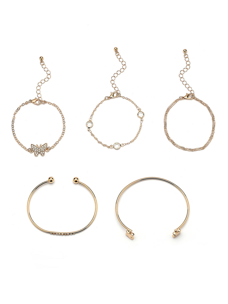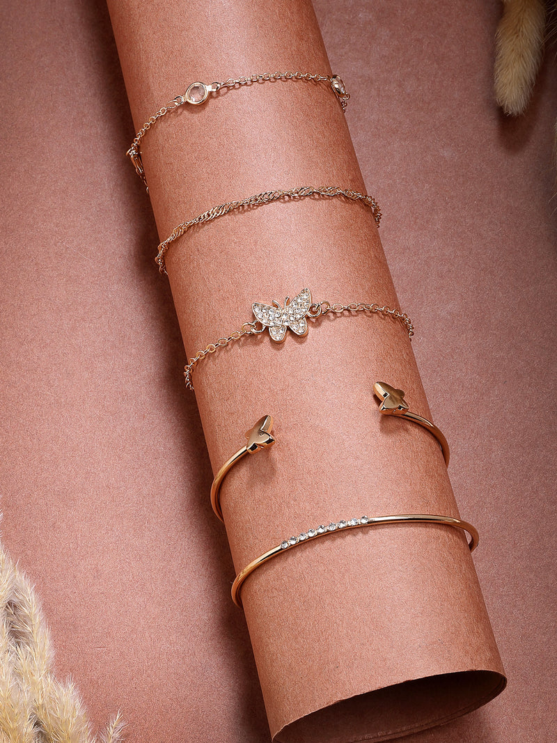 Scintillare By Sukkhi Western Fashion Set of 5 Stylish Multilayer Crystal Stone Studded Gold Plated Charm Kada Bracelet Combo Jewellery for Women& Girls|Pack of 5. Scintillare By Sukkhi brings you a Western fashion-inspired set of 5 multilayer gold-plated charm kada bracelets, each thoughtfully crafted with crystal stone embellishments. This versatile combo offers a mix of stylish designs, blending elegance with a modern flair that complements both ethnic and contemporary outfits. Ideal for festive occasions, casual outings, or gifting purposes, these bracelets can be worn individually or layered for a bolder look. With detailed craftsmanship and sparkling accents, this set adds a graceful touch to any ensemble. A great accessory choice for women and girls who love to experiment with their everyday and occasion wear.