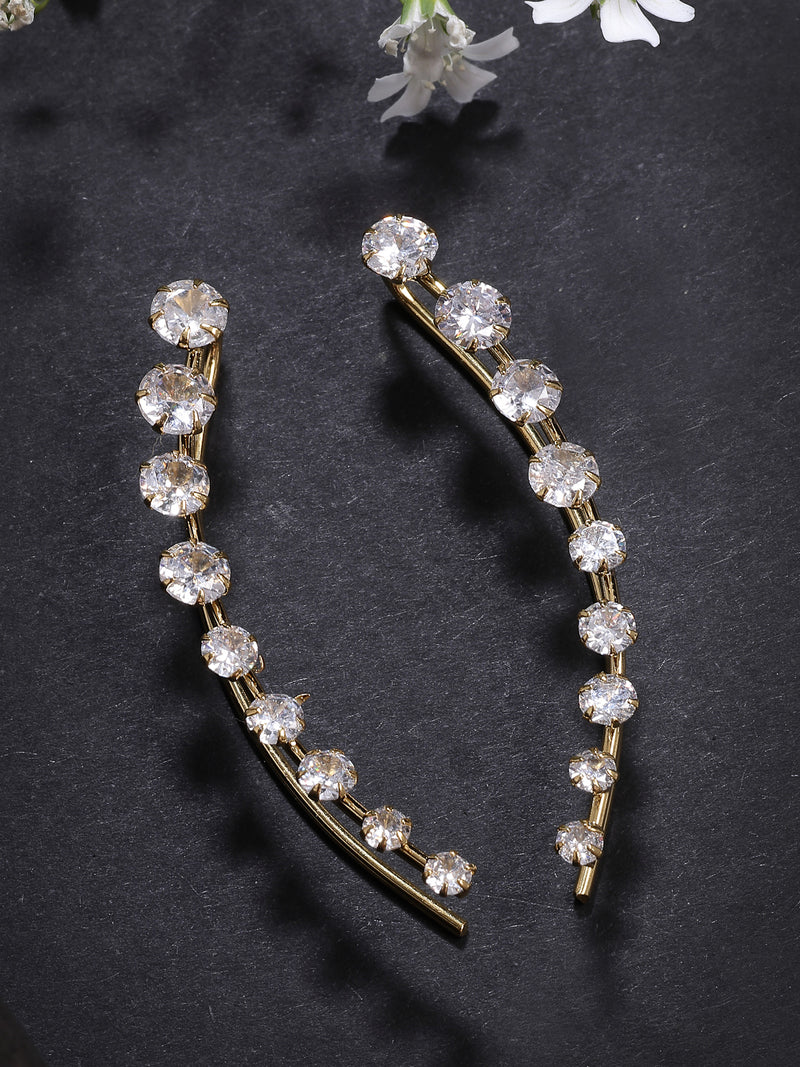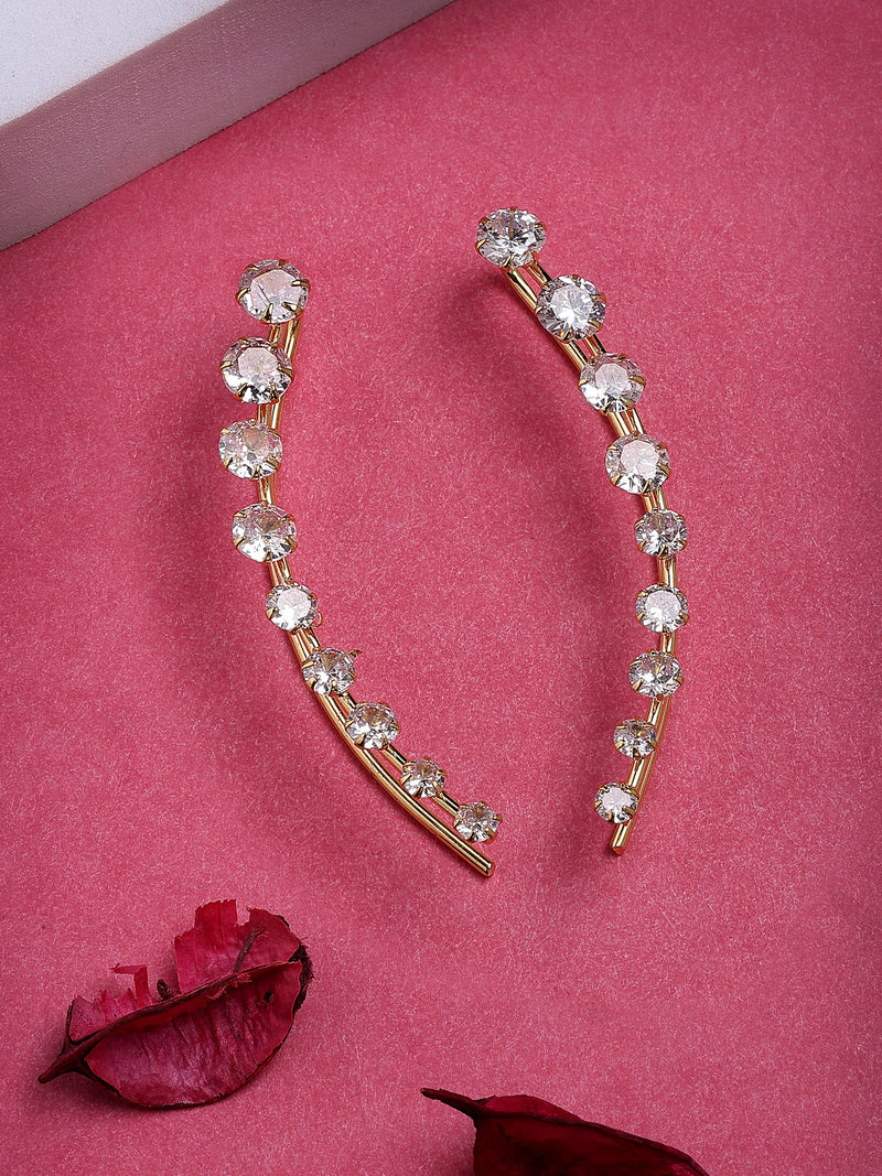 Scintillare By Sukkhi Delicate Gold Plated American Diamond Studded Contemporary Embellished Light Weighted Ear Cuff with Clip on Closure Earring for Women & Girls. Scintillare By Sukkhi brings you a delicate gold plated ear cuff earring designed to elevate your accessory game. Studded with shimmering American Diamonds, this piece reflects a modern flair blended with classic charm. Its contemporary embellished design wraps gracefully around the ear, while the clip-on closure ensures a secure and comfortable fit without the need for piercing. Lightweight and stylish, it is ideal for festive occasions, casual outings, or special celebrations. A versatile piece for women and girls who love experimenting with their look, this ear cuff adds a unique touch to any outfit. A chic and thoughtful gift option.
