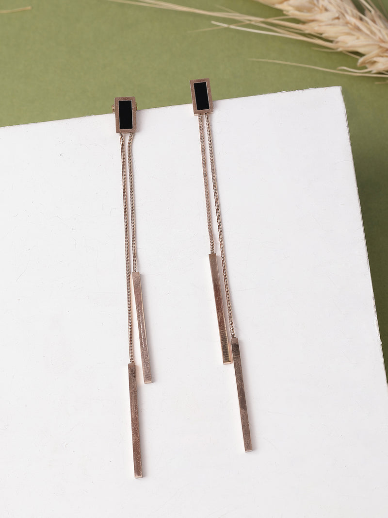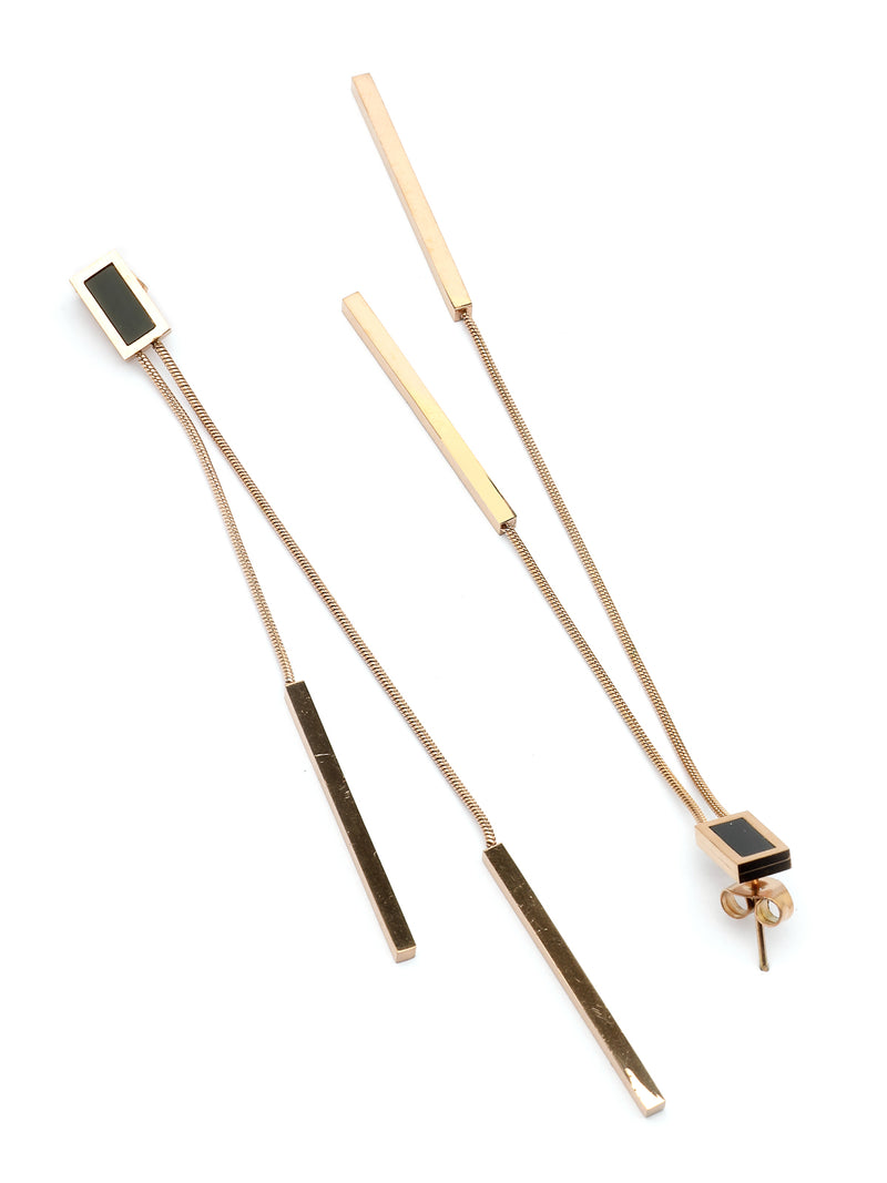 * Chic Long Chain Design: These stylish Gold plated dangler earrings with sleek black accents and long chains offer a bold yet elegant fashion-forward statement.
