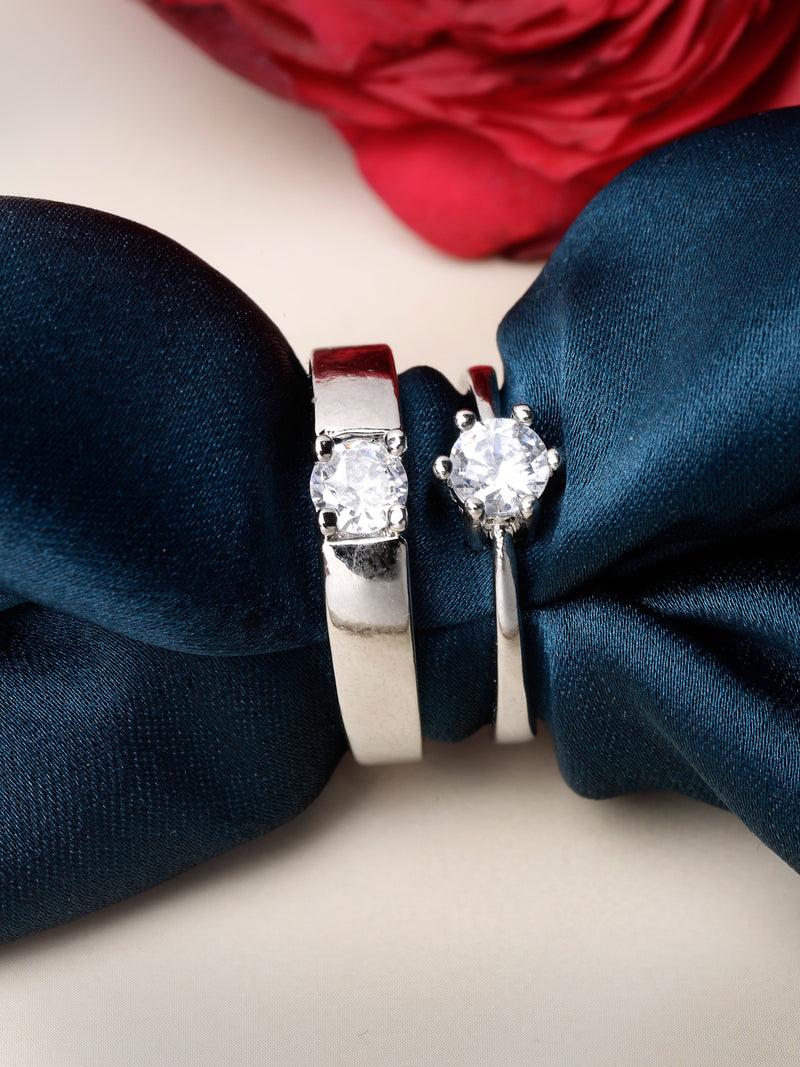 Discover timeless elegance with Scintillare by Sukkhi's charming Couple Promise Finger Ring set. Crafted with rhodium-plated silver and adorned with American diamond solitaires, these stylish rings create a symbol of enduring love. Perfect for couples, the set is an ideal expression of commitment and makes for a thoughtful Valentine's Day gift. Embrace the essence of romance and sophistication with Scintillare, a collection that captures the beauty of love in each intricately designed piece.