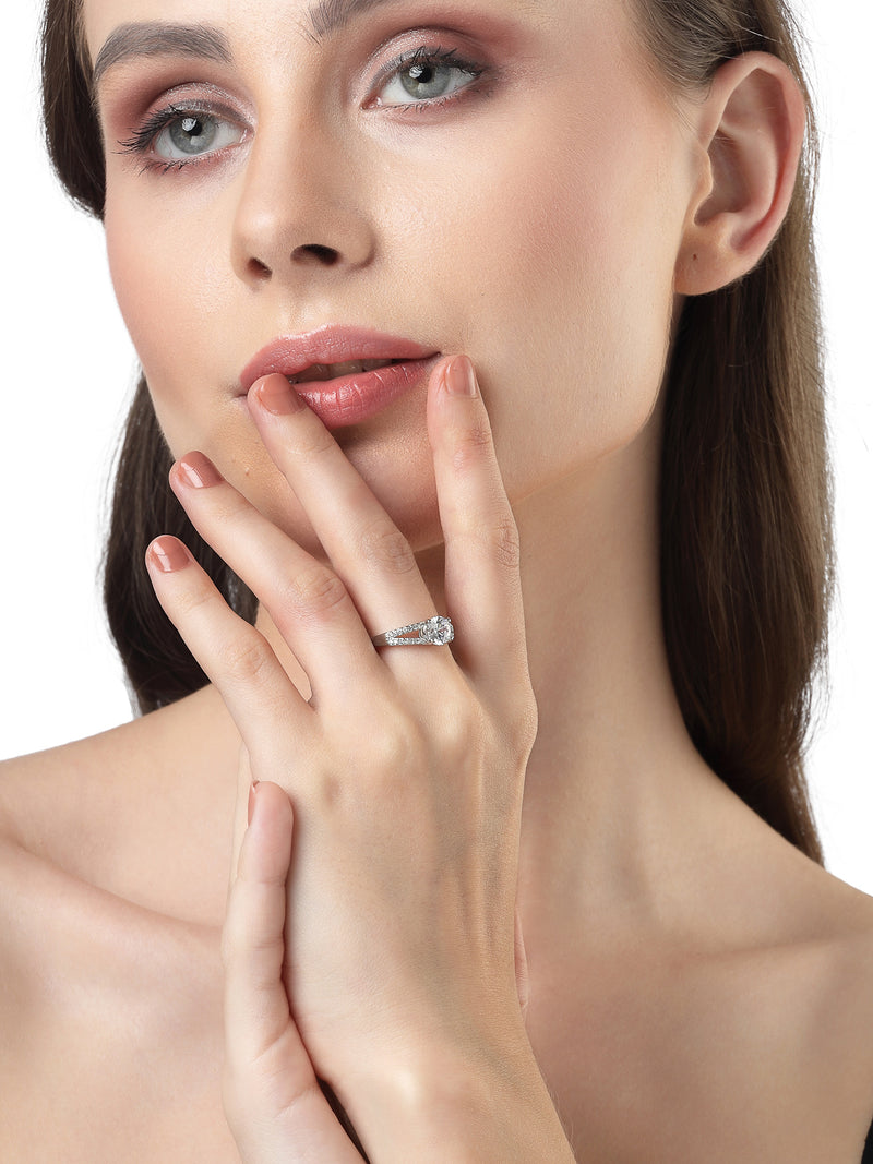 Adorn your fingers with the timeless elegance of Scintillare by Sukkhi's Ravishing Classic Solitaire Rhodium Plated Silver Finger Ring. This exquisite ring, designed for women and girls, features a captivating solitaire design embellished with American Diamonds. The rhodium plating enhances its brilliance, making it a perfect choice for special occasions and an ideal Valentine's Day gift. Elevate your style with the understated glamour and sophistication of this classic solitaire ring, a symbol of everlasting beauty and grace.
