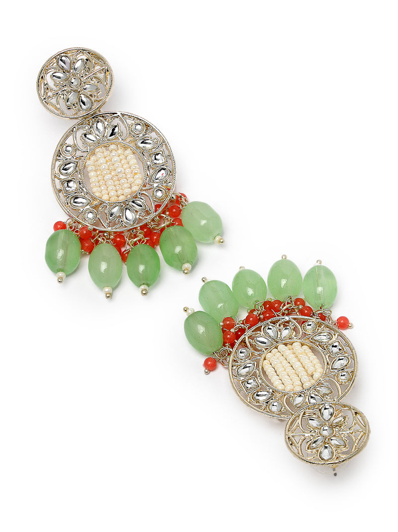Studio Sukkhi Classical Gold Plated Kundan Studded Mint Green Dangle Drop Earrings For Women And Girls (E105768). Elevate your elegance with Studio Sukkhi's Classical Gold Plated Kundan Studded Dangle Drop Earrings. Crafted for women and girls who appreciate timeless beauty, these earrings showcase exquisite mint green Kundan stones in a classic design. Plated in radiant gold, they exude opulence and charm, adding a touch of ethnic elegance to any outfit. Make a statement with these captivating dangle drop earrings that seamlessly blend classical aesthetics with modern flair. These versatile and chic pieces are a must-have addition to your jewelry collection, perfect for enhancing your style with their classical and elegant appeal.