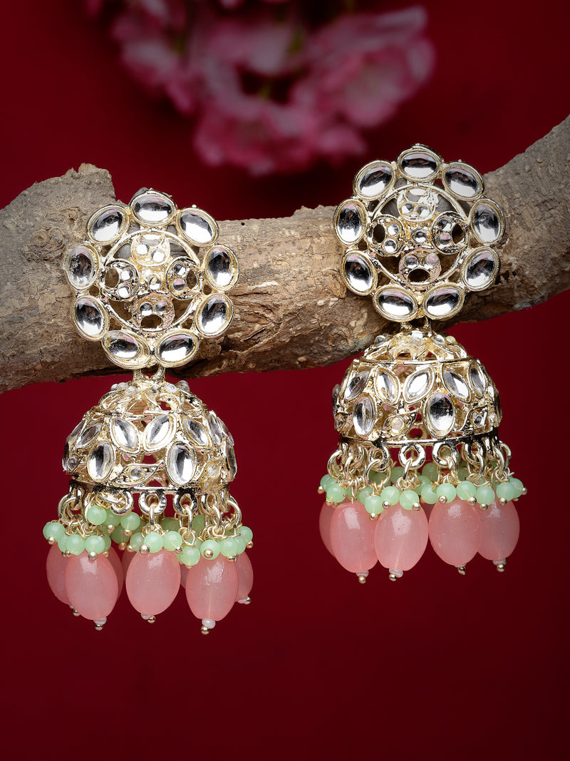 Studio Sukkhi Elegant Gold Plated With Kundan Studded Pink Jhumka/Jhumki Earrings For Women And Girls (E105771). Elevate your elegance with Studio Sukkhi's Elegant Gold Plated Kundan Studded Pink Jhumka Earrings. Crafted for women and girls who appreciate timeless beauty, these jhumkis feature exquisite Kundan stones in a graceful pink hue. Plated in radiant gold, they exude opulence and charm, adding a touch of ethnic elegance to any outfit. Make a statement with these captivating jhumka earrings that seamlessly blend classical aesthetics with modern flair. These versatile and chic pieces are a must-have addition to your jewelry collection, perfect for enhancing your style with their elegant and timeless appeal.