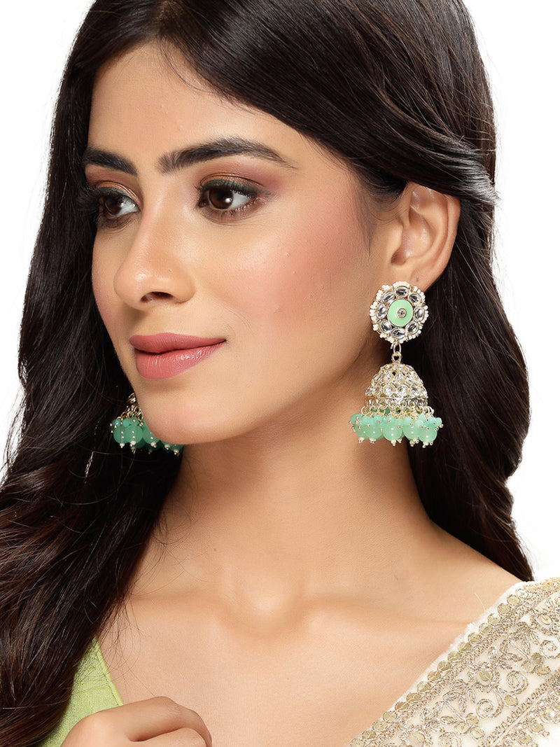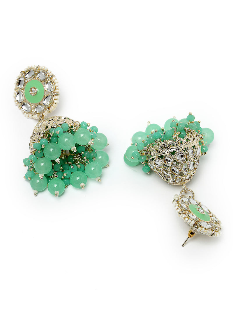 * Indian Traditional Design: These jhumka/jhumki earrings feature a traditional Indian design with intricate Kundan and green Meenakari work, celebrating the rich heritage of Indian jewelry.
