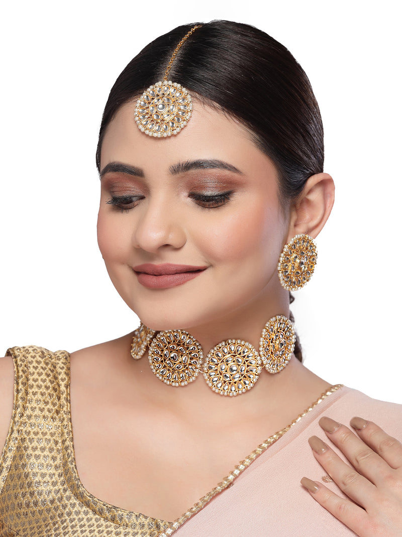 Indulge in Sukkhi's Admirable Geometric Gold Tone Plated Kundan Studded White Collarbone Necklace Set. This elegant jewelry set, featuring Studs Earrings and Maangtika, showcases a mesmerizing blend of geometric design and Kundan embellishments. The Latest Design adds a contemporary touch, making it a perfect choice for women and girls. Elevate your fashion statement with this unique and graceful jewelry set, suitable for various occasions and celebrations.