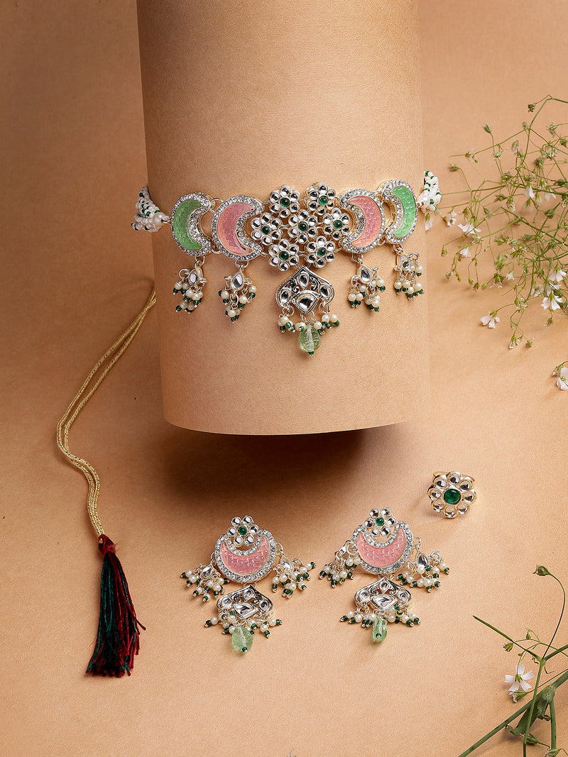 Sukkhi Attractive Pink Green Stones Kundan Studded with Multistrand Beaded Choker Necklace & Drop Earring Jewellery Set for Women & Girls|NS107355 Enhance your ethnic collection with the Sukkhi Attractive Pink and Green Stones Kundan Studded Choker Necklace set. Featuring a multistrand beaded design, this set beautifully combines vibrant pink and green stones with traditional Kundan detailing. The matching drop earrings complement the choker perfectly, creating a harmonious and eye-catching look. Ideal for weddings, festivals, and special occasions, this jewellery set adds a splash of color and elegance to any outfit. Designed for women and girls who appreciate timeless ethnic styles, this set offers a charming blend of tradition and modernity to elevate your festive wardrobe with grace and style.