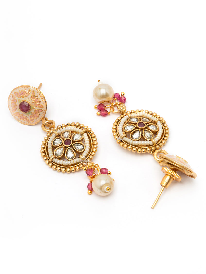 The Sukkhi Charming Gold Plated Kundan Studded with Meenakari Work Round Choker Necklace Set with Dangle Earrings is a stunning piece that combines traditional elegance with modern design. The choker features beautiful Kundan stones and intricate Meenakari work, creating a vibrant and eye-catching design. The gold-plated finish adds a warm, timeless appeal to the piece. The matching dangle earrings complement the necklace, offering a graceful and sophisticated touch. Ideal for women, this jewellery set is perfect for weddings, festivals, and special occasions, making it a perfect addition to any collection, adding a refined and elegant touch to any outfit.