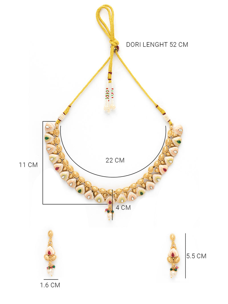 * Classic-Inspired Design: Sukkhi Gold Plated Choker Necklace Set features traditional Kundan stones with intricate Meenakari work, adding elegance to your ethnic look. Gold Plating: The gold plating enhances the necklace's beauty, making it a standout accessory for special occasions.