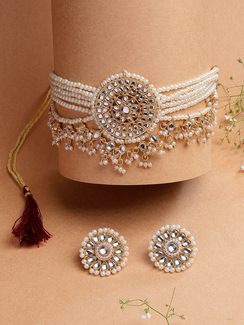 Sukkhi Classic Traditional Gold Tone Plated Kundan Studded Multistrand White Pearls Choker Necklace with Studs Earrings Jewellery Set For Women & Girls |NS107376 Embrace timeless charm with the Sukkhi Classic Traditional Jewellery Set, designed to elevate your ethnic look. This set features a gold tone plated choker necklace adorned with Kundan stones and layered white faux pearls, offering a graceful blend of traditional and artistic design. Accompanied by matching stud earrings, the ensemble adds a refined touch to festive wear, wedding attire, or cultural events. Its multistrand pearl detailing provides a statement look that suits both women and girls. Perfect for pairing with sarees, lehengas, or anarkalis, this set offers a graceful addition to your accessory collection for any celebration.