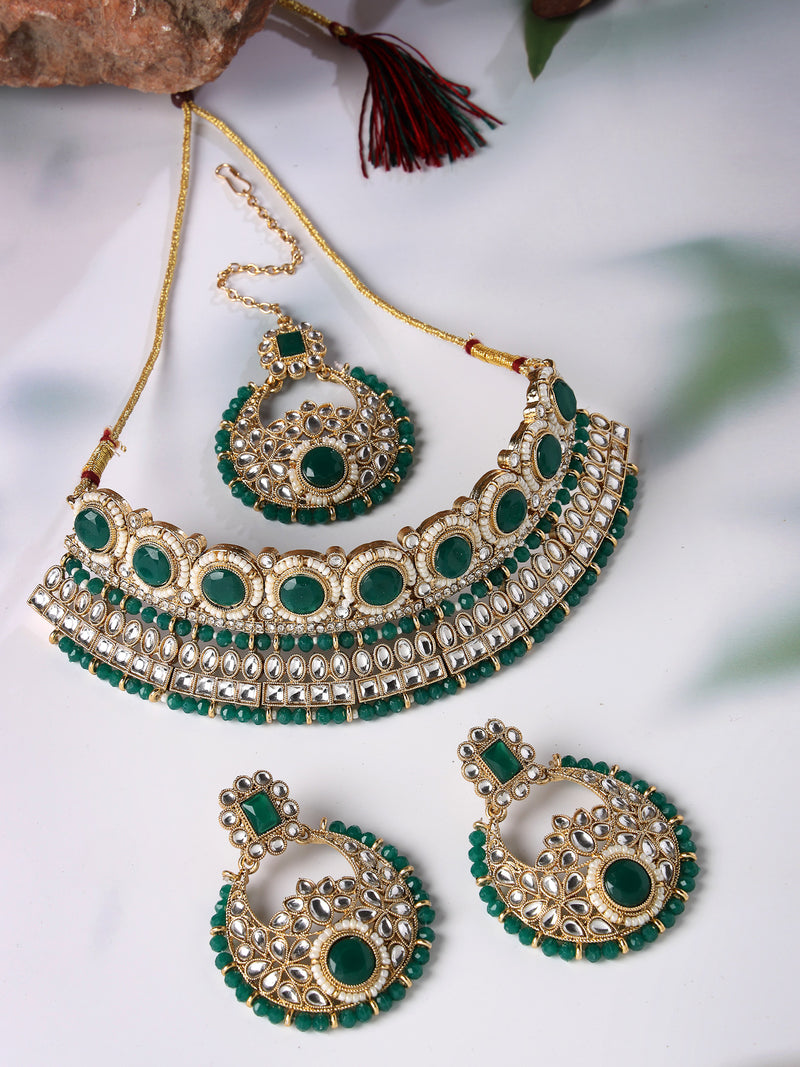 Step into the world of fashion-forward elegance with the Sukkhi Fashion-Forward Gold Plated Green Kundan & Beads Choker Necklace Earring With Maangtika Jewellery Set. This exquisite set is a true celebration of style and grace, featuring a choker necklace adorned with trendy green Kundan stones and delicate beads that exude charm. The matching earrings and maangtika (forehead ornament) complete the ensemble, adding a touch of contemporary allure to your look. Plated in lustrous gold, this jewelry set seamlessly blends modern design with a hint of ethnicity. Whether it's a party, wedding, or any special occasion, the Sukkhi jewelry set will make you shine with its captivating beauty and poise. A must-have addition to every woman's cherished collection, defining sophistication and versatility in style.