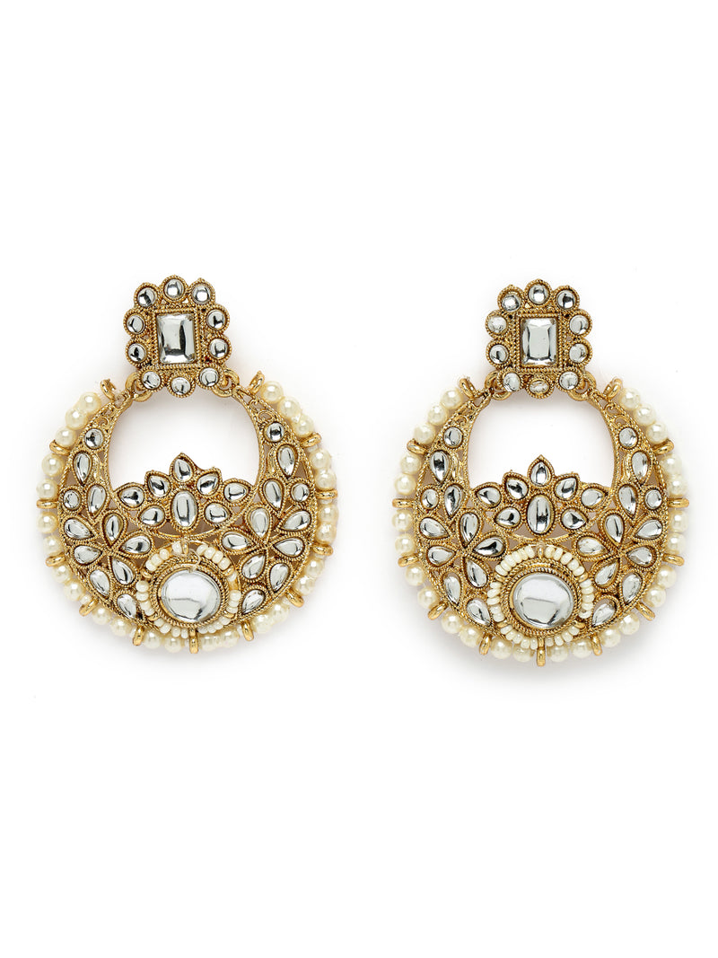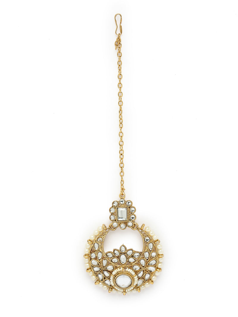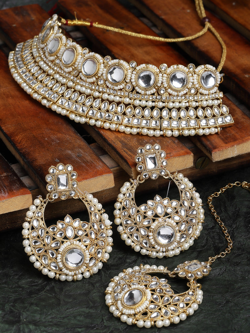 Embrace the essence of fashion-forward elegance with the Sukkhi Fashion-Forward Gold Plated White Kundan & Beads Choker Necklace Earring With Maangtika Jewellery Set. This exquisite set is a true celebration of style and grace, featuring a choker necklace adorned with pristine white Kundan stones and delicate beads that exude charm. The matching earrings and maangtika (forehead ornament) complete the ensemble, adding a touch of contemporary allure to your look. Plated in lustrous gold, this jewelry set seamlessly blends modern design with a hint of ethnicity. Whether it's a party, wedding, or any special occasion, the Sukkhi jewelry set will make you shine with its captivating beauty and poise. A must-have addition to every woman's cherished collection, defining sophistication and versatility in style.