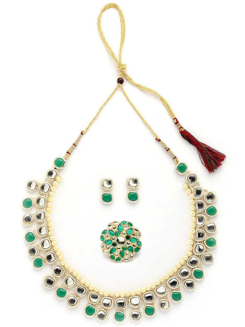 Sukkhi Versatile Fashion Design Gold Plated Kundan with Multilayers Green Necklace & Drop Earring & Ring Jewellery Set For Women & Girls|NS107348 Add elegance to your collection with the Sukkhi Versatile Fashion Design Gold Plated Kundan Jewellery Set. Featuring a multilayer green necklace adorned with Kundan stones, this set includes matching drop earrings and a ring, creating a coordinated look. The intricate craftsmanship blends traditional design with contemporary style, perfect for weddings, parties, and festive occasions. Designed for women and girls who appreciate detailed and versatile accessories, this set complements a variety of ethnic outfits with its rich color and refined appeal. Elevate your ensemble effortlessly with this striking jewellery set that balances charm and sophistication in every detail.