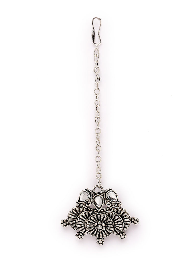 Get noticed with the Sukkhi Eye-Catchy Oxidised Silver Plated Choker Necklace with Earring Mangtikka Set. This striking set features an intricately designed choker necklace and matching earrings and mangtikka (forehead ornament) plated in captivating oxidised silver. The unique design exudes elegance and charm, adding a touch of bohemian allure to your look. The necklace sits gracefully on the collarbone, while the earrings and mangtikka complete the ensemble, creating a stunning and cohesive jewelry set. Whether it's a festive occasion or a special celebration, the Sukkhi jewelry set will make you stand out with its eye-catching beauty and poise. A must-have addition to every woman's cherished collection, defining grace and versatility in style.