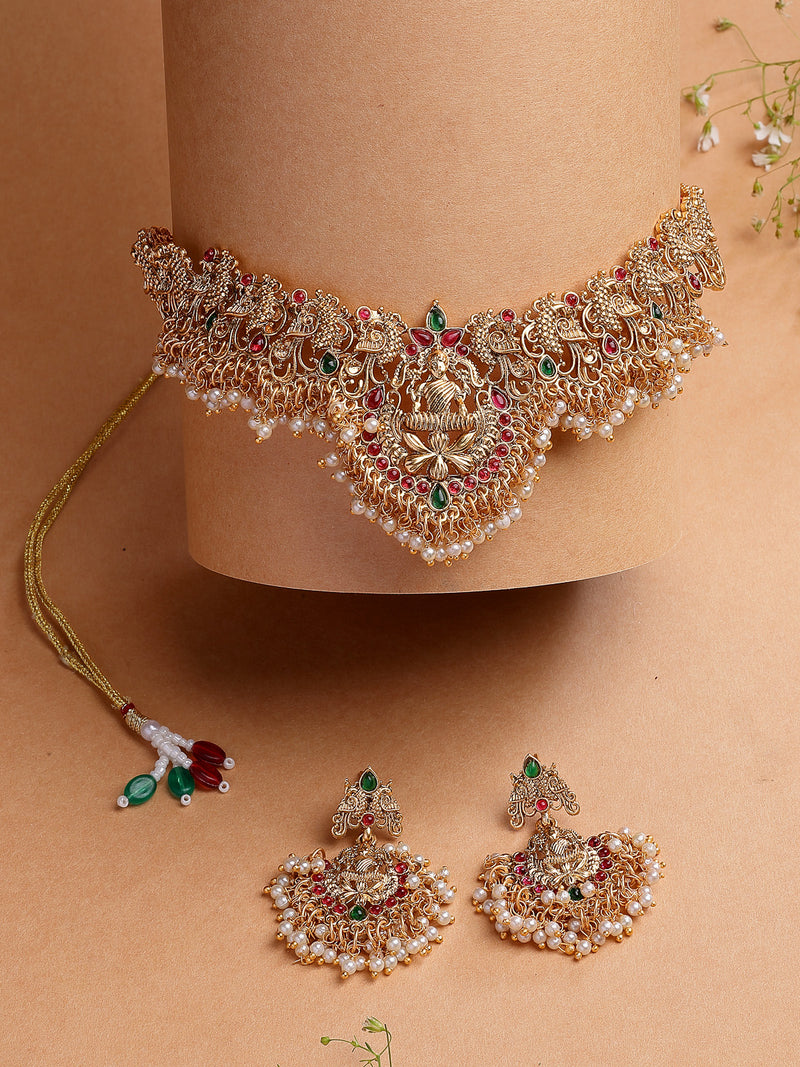 Sukkhi South Indian Traditional Stylish Peacock Shaped Gold Plated with Beaded Studded Red Green Choker Necklace with Dangle Earring Jewellery Set for Women & Girls|NS107351|Celebrate South Indian heritage with the Sukkhi Traditional Peacock Shaped Gold Plated Choker Necklace set. This striking jewellery features intricate peacock motifs adorned with red and green beads, paired with matching dangle earrings to complete the look. The gold plating enhances the detailed craftsmanship, making it ideal for festivals, weddings, and cultural events. Designed for women and girls who appreciate classic ethnic accessories, this set adds vibrant color and elegance to your attire. Its bold design and festive appeal make it a perfect choice to elevate your traditional wardrobe with a graceful and eye-catching statement piece.