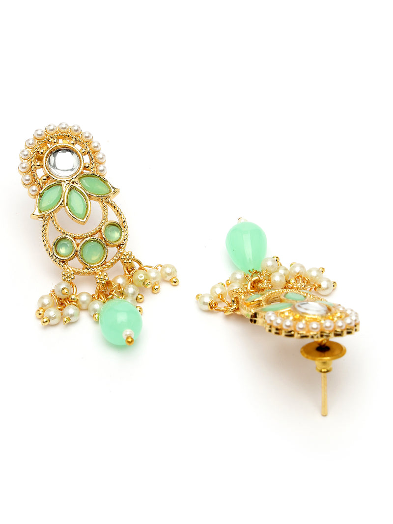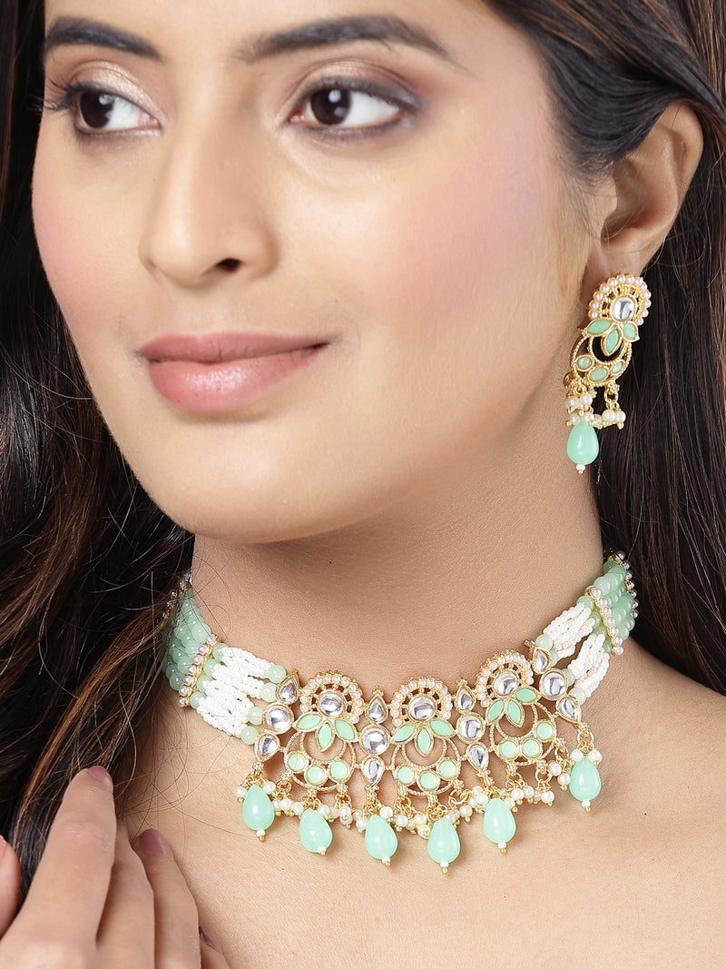 * Elegant Design: Sukkhi Gold Plated Multistrand Choker Necklace Set features mint green pearls and AD stones, offering a graceful and stylish look. Gold Plating: The gold plating adds a radiant charm, making it ideal for weddings, parties, and festive events.