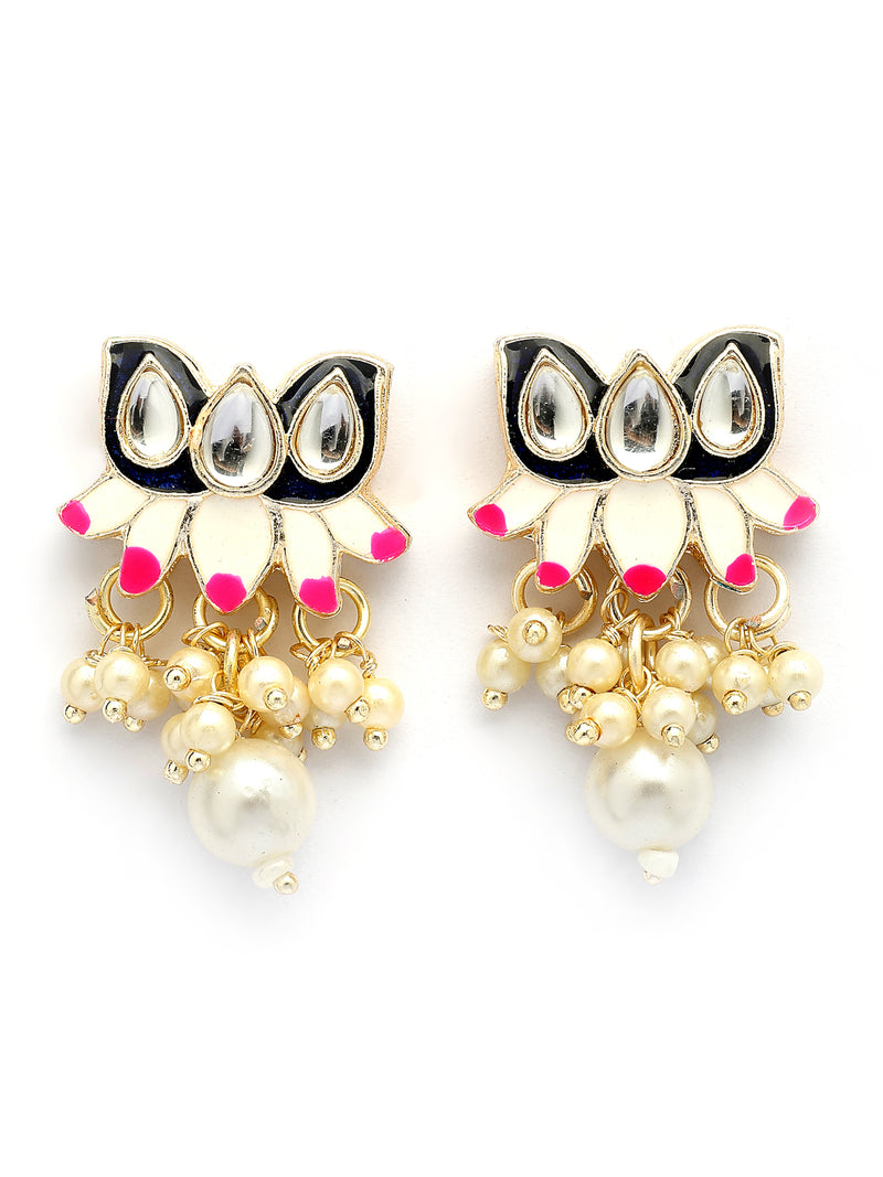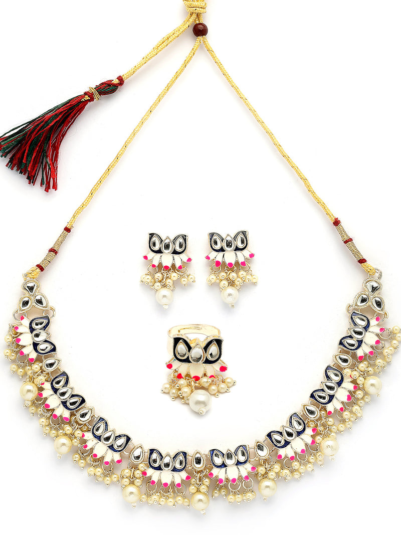 Sukkhi Graceful Fashion Style Gold Plated Blue & Pink Meenakari Lotus Design with Faux Pearls Studded Choker Necklace with Drop Earring & Ring Jewellery Set For Women & Girls|NS107346