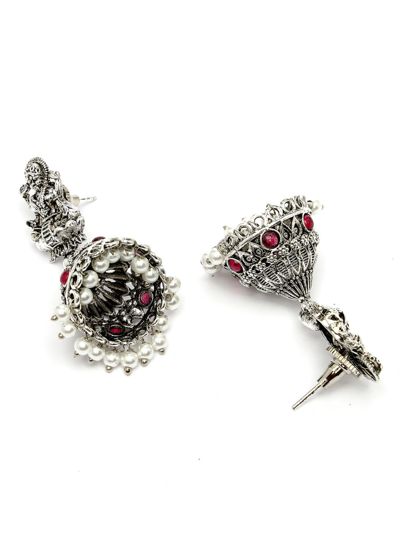 The Sukkhi Classic-Inspired Oxidised German Silver Plated with Red AD Stones Studded Temple Choker Necklace Set with Jhumki Earrings is a beautiful fusion of tradition and elegance. The choker features intricate temple-inspired designs, enhanced with vibrant red AD stones, creating a striking and captivating look. The oxidised German silver plating adds a vintage charm to the piece. The matching Jhumki earrings perfectly complement the necklace, making it ideal for women and girls. Perfect for weddings, festivals, or special occasions, this set adds a touch of sophistication and grace to any outfit, making it a timeless addition to your jewellery collection.