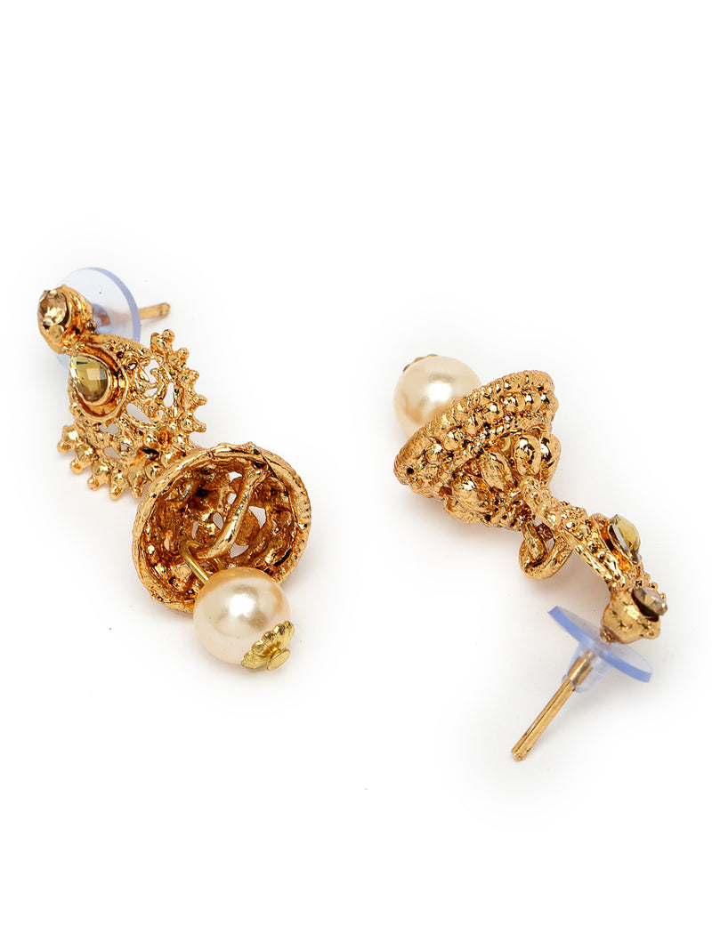 Step into the realm of timeless beauty with the Sukkhi Classical Temple Gold Plated Copper Beads Studded Long Necklace With Jhumke Earring Jewellery Set. This exquisite set features a classical temple-inspired long necklace adorned with intricate copper beads and studded detailing, evoking the grandeur of Indian heritage. The matching jhumke earrings complement the necklace, adding a touch of elegance to your overall ensemble. Plated in resplendent temple gold, this set seamlessly blends traditional design with a touch of luxury. Whether it's a wedding, festive occasion, or any special event, the Sukkhi jewelry set will make you shine with its regal charm and allure. A must-have addition to every woman's cherished collection, defining elegance and style with grace.