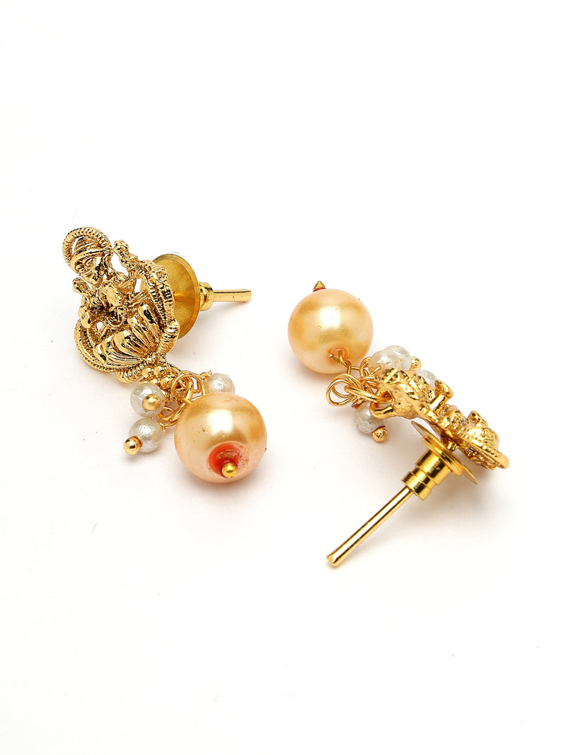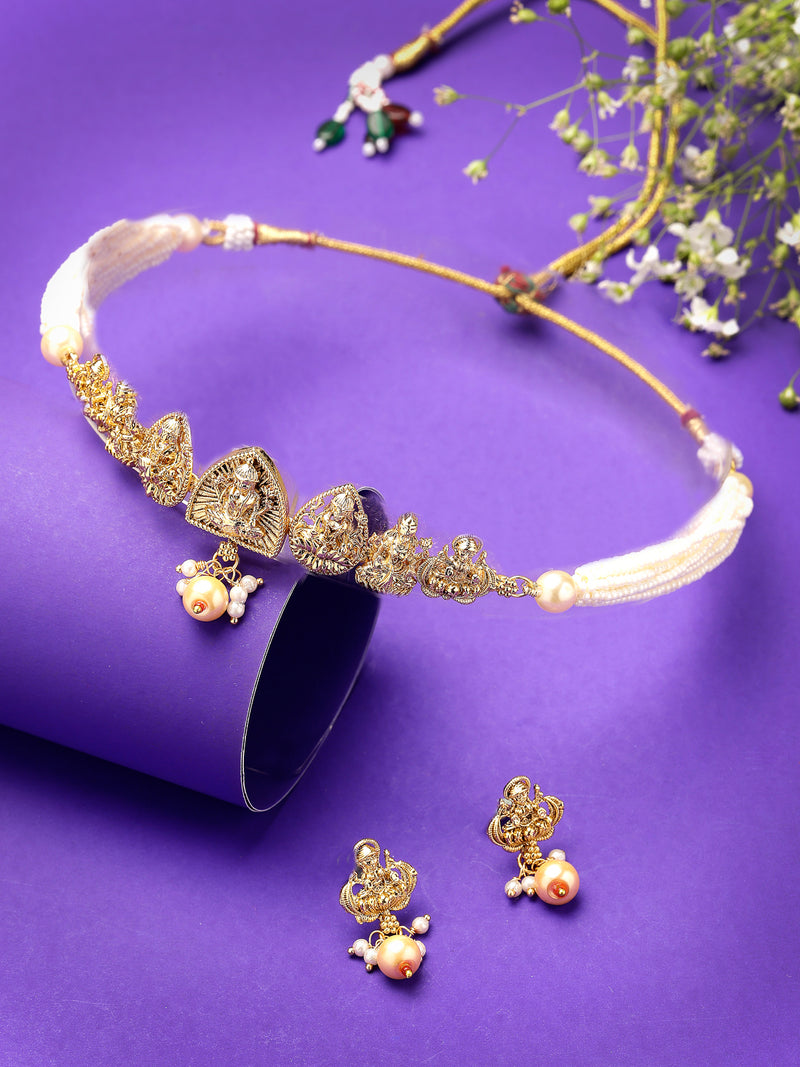 The Sukkhi Ethnic Gold Plated Multistrand Temple Choker Necklace Set is a perfect fusion of traditional and modern design. Featuring multiple strands of delicate white beads, this choker necklace is beautifully accented with a gold-plated finish for an elegant touch. The set is complemented by matching drop earrings that enhance the overall look. Ideal for cultural occasions, festivals, or weddings, this jewellery set is a statement piece that adds a graceful and timeless charm to any outfit. A must-have for women and girls who love to embrace heritage-inspired styles with a contemporary twist.