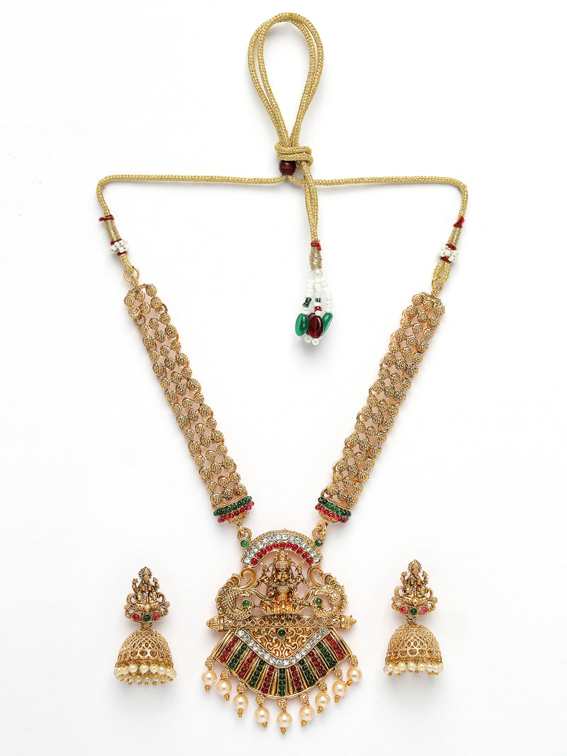 * Complete Set: Includes a gold-plated choker, temple haram necklace, and jhumki earrings, offering a coordinated and stylish appearance.