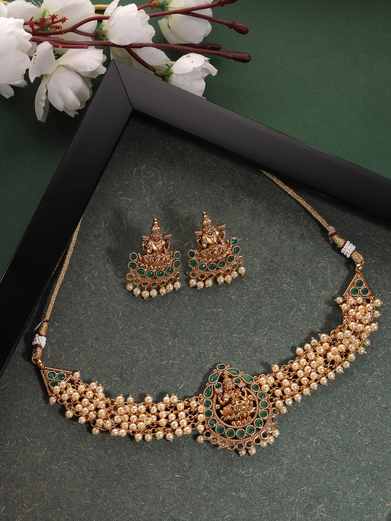 Illuminate your style with the Sukkhi Sparkling Indian Temple Gold Plated Green Beads Choker Necklace With Studs Earring Jewellery Set. This captivating set is inspired by Indian temple artistry, featuring a choker necklace adorned with sparkling green beads that evoke traditional charm. The matching studs earrings complete the ensemble, adding a touch of elegance to your look. Plated in resplendent gold, this jewelry set seamlessly blends cultural heritage with contemporary flair. Whether it's a festival, wedding, or any special occasion, the Sukkhi jewelry set will make you stand out with its captivating beauty and poise. A must-have addition to every woman's cherished collection, defining grace and versatility in style.