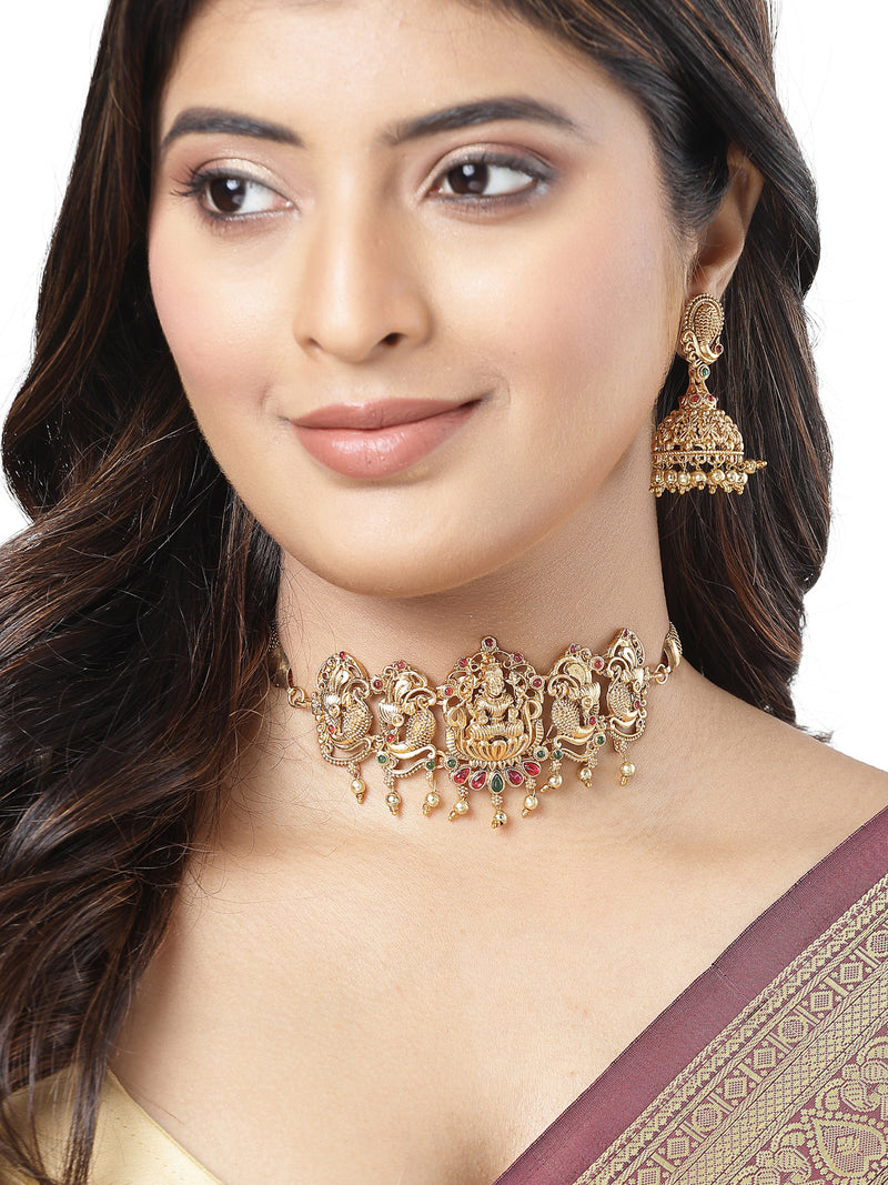 * Traditional Temple Design: Sukkhi Gold Plated Choker Necklace Set features a classic temple-inspired design with intricate details, adding charm to ethnic attire. Gold Plating: The gold plating enhances the traditional appeal, making it a perfect choice for cultural events.