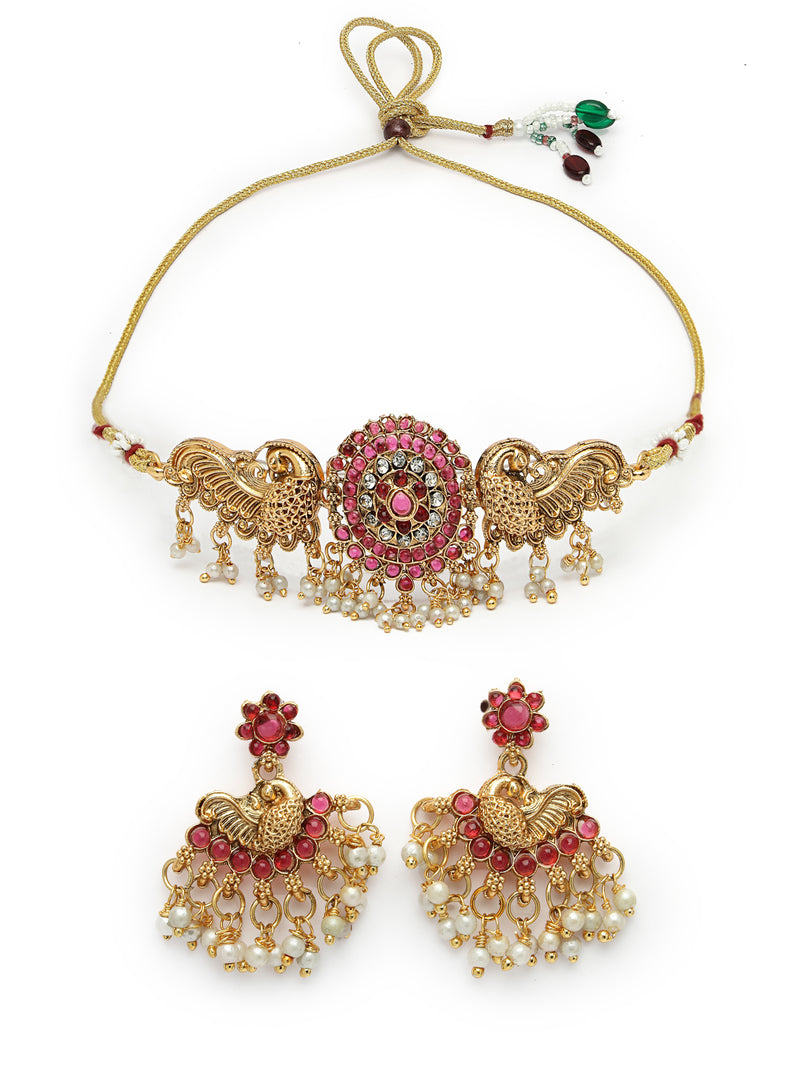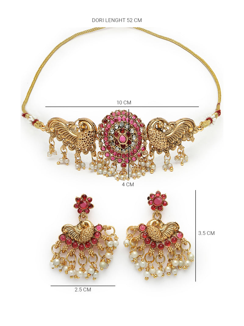 Sukkhi Classic-Inspired Gold Plated Red AD Stones Studded Temple Choker Necklace With Dangler Earring Jewellery Set For Women & Girls|NS106120