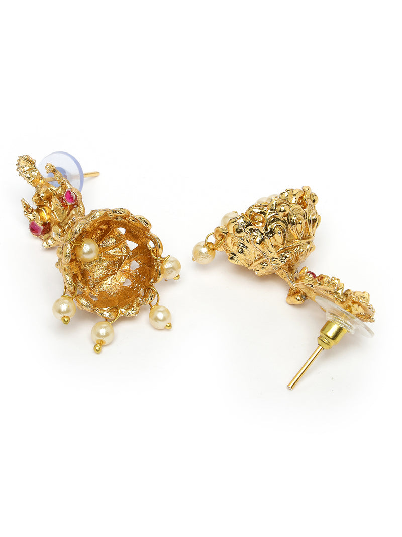 The Sukkhi Traditionally Gold Plated Red Green AD Stones Studded Long Temple Gold Haram Designs Necklace Set with Jhumki/Jhumka Earrings is a stunning accessory for women and girls. The long necklace features intricate temple designs, with vibrant red and green AD stones that add color and elegance. The gold-plated finish enhances its timeless appeal, making it perfect for traditional events and celebrations. Paired with matching jhumki/jhumka earrings, this set creates a complete and refined look. Ideal for weddings, festivals, or cultural gatherings, this jewellery set adds a touch of heritage and charm to your attire.