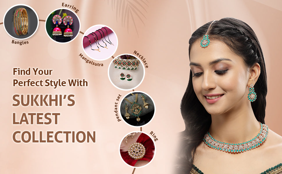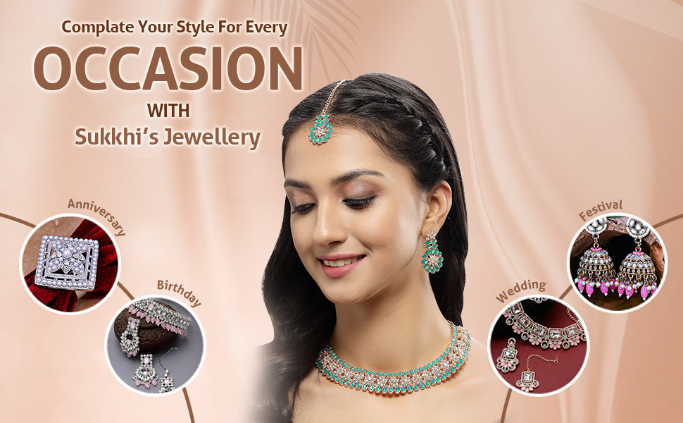 * Complete Jewelry Ensemble: With a coordinated collar bone necklace, earrings, and Maangtika, this Sukkhi jewellery set provides a well-matched and complete ensemble, suitable for weddings, parties, and special occasions.