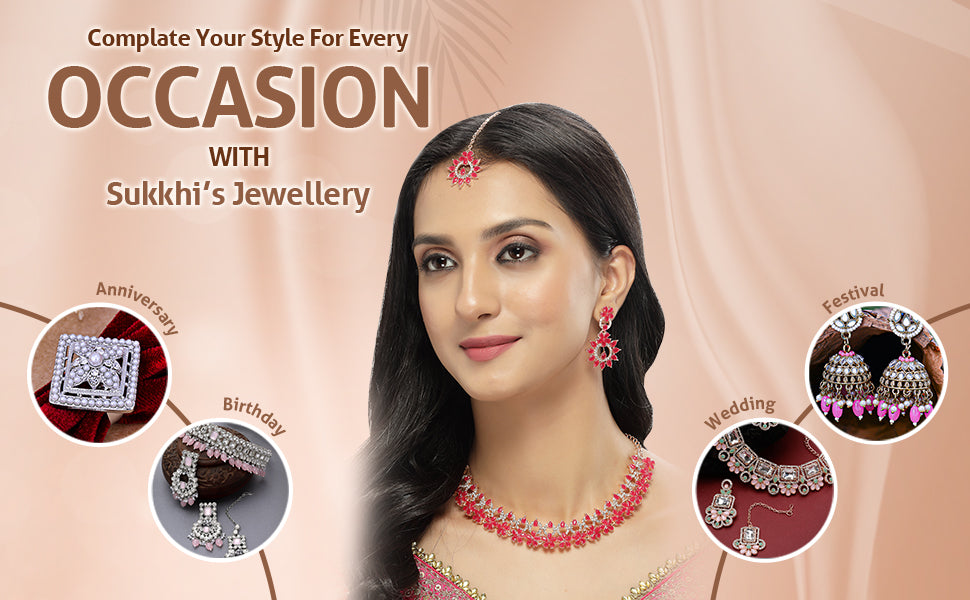 * Complete Jewelry Ensemble: With a coordinated collar bone necklace, earrings, and Maangtika, this Sukkhi jewellery set provides a well-matched and complete ensemble, suitable for weddings, parties, and special occasions.