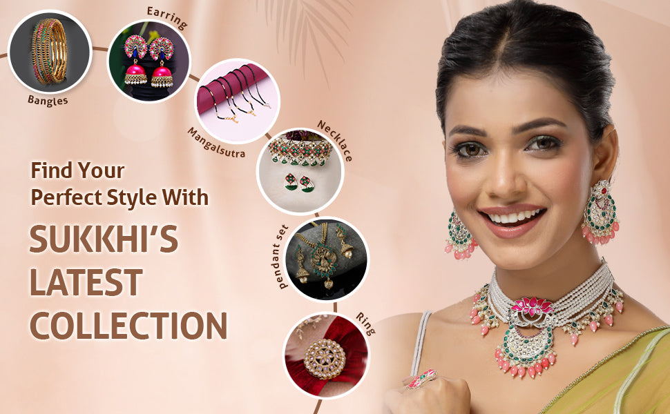 Sukkhi All-Season Fashionable Gold Plated Green & Pink Meenakari Lotus with Multistrand Pearls Choker Necklace Chandbali Earring & Ring Jewellery Set For Women & Girls|NS107369 The Sukkhi All-Season Gold Plated Jewelry Set features a stunning green and pink Meenakari lotus design that adds a vibrant touch to any outfit. This elegant set includes a multistrand pearls choker necklace, matching Chandbali earrings, and a coordinating ring, perfect for women and girls who enjoy ethnic fashion. Crafted with intricate detailing, the set complements both traditional and contemporary styles. Its versatile design makes it suitable for festive occasions, celebrations, or casual wear. This ensemble brings together colorful artistry and timeless charm, enhancing your jewelry collection with its unique and attractive appeal.