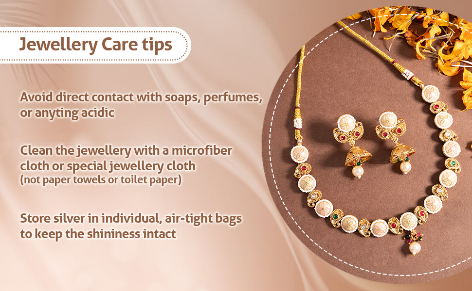 * Care Instruction : Avoid water contact, including swimming or bathing. Keep away from chemicals like perfumes and lotions. Store in a cool, dry place away from sunlight. Clean gently with a soft, lint-free cloth. Handle delicately to avoid bending or pulling. This will keep your jewellery shining for years.