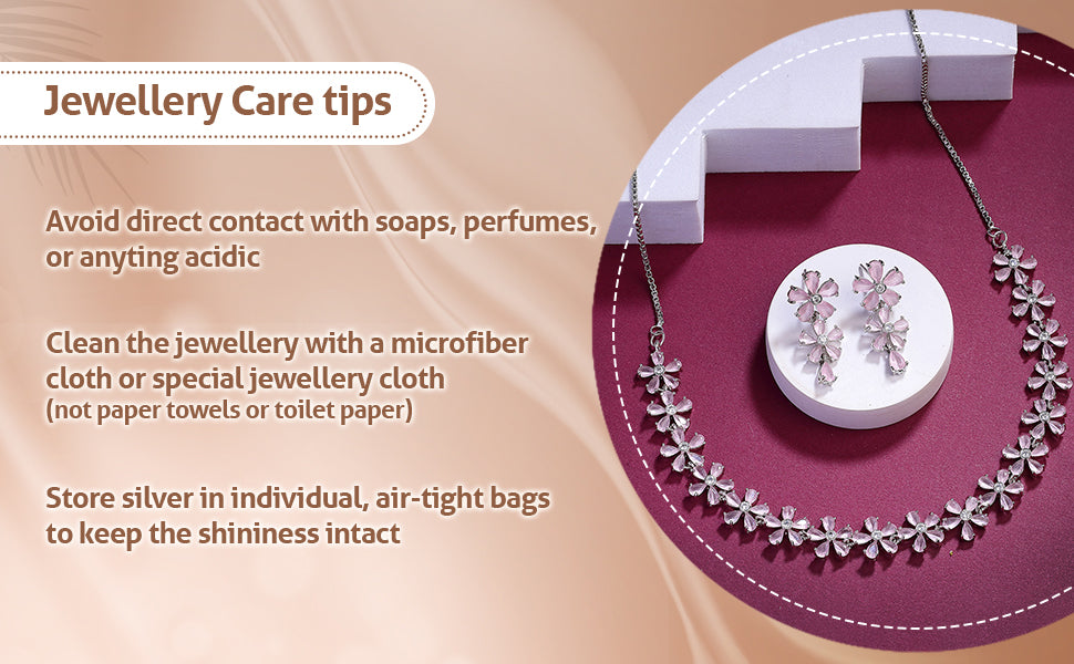 Sukkhi Attractive Rhodium Plated Silver Toned with American Diamond Studded Floral Shaped Pink Choker Necklace with Drop Earring Jewellery Set For Women & Girls|NS107417|Enhance your festive or party look with the Sukkhi Attractive Rhodium Plated Silver Toned Jewellery Set. This beautifully crafted choker necklace features floral-shaped detailing, embellished with sparkling American diamonds and a touch of pink for added charm. The coordinating drop earrings complement the design, creating a cohesive and stylish appearance. Ideal for both traditional and contemporary outfits, this set brings elegance and vibrancy to any occasion. Whether it’s a celebration or a casual gathering, this design helps you stand out with ease. A perfect pick for women and girls who love graceful, eye-catching accessories with a modern appeal.