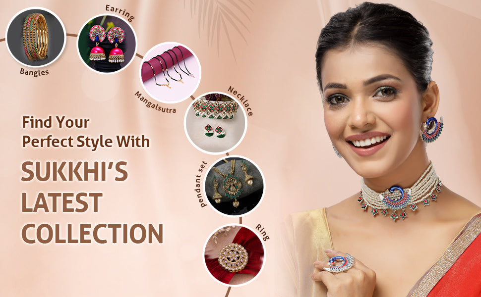 Sukkhi Attractive Stylish Multicolor Meenakari work with Gold Plated Peacock Inspired Multistrand Faux Pearls Choker Necklace with Earring & Ring Jewellery Set For Women & Girls|NS107368 The Sukkhi Attractive Multicolor Meenakari Work Choker Necklace set combines traditional charm with modern design. Featuring gold plating and a peacock-inspired motif, this multistrand faux pearls necklace is enhanced with vibrant Meenakari detailing. The set includes matching earrings and a ring, perfect for completing any festive or special occasion outfit. Its rich colors and intricate craftsmanship add an eye-catching appeal, making it suitable for women and girls who appreciate unique ethnic accessories. This jewelry set effortlessly blends elegance and style, making it a standout addition to your collection for celebrations and cultural events.